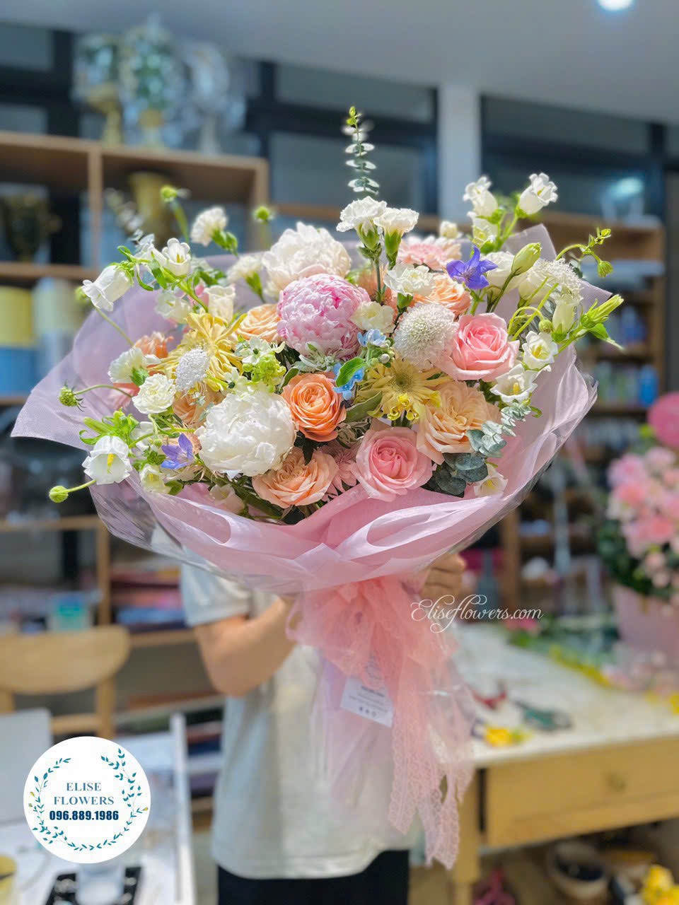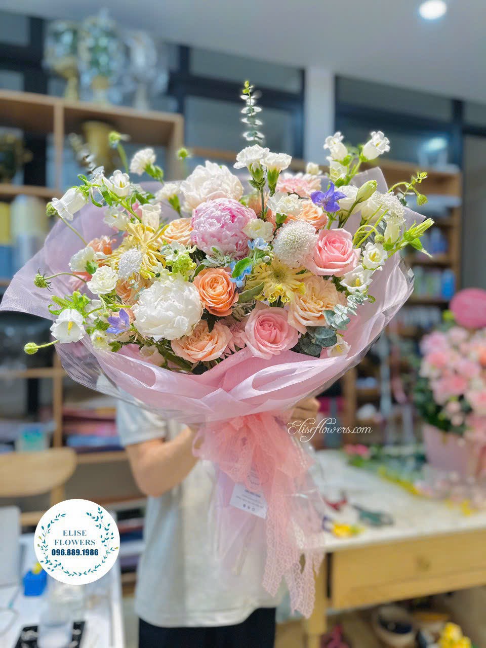 Cách 2: Quý khách có thể gọi qua hotline Tiệm hoa Eliseflowers: 0968891986 - 0945891986 Zalo, call để được tư vấn mẫu hoa phù hợp.