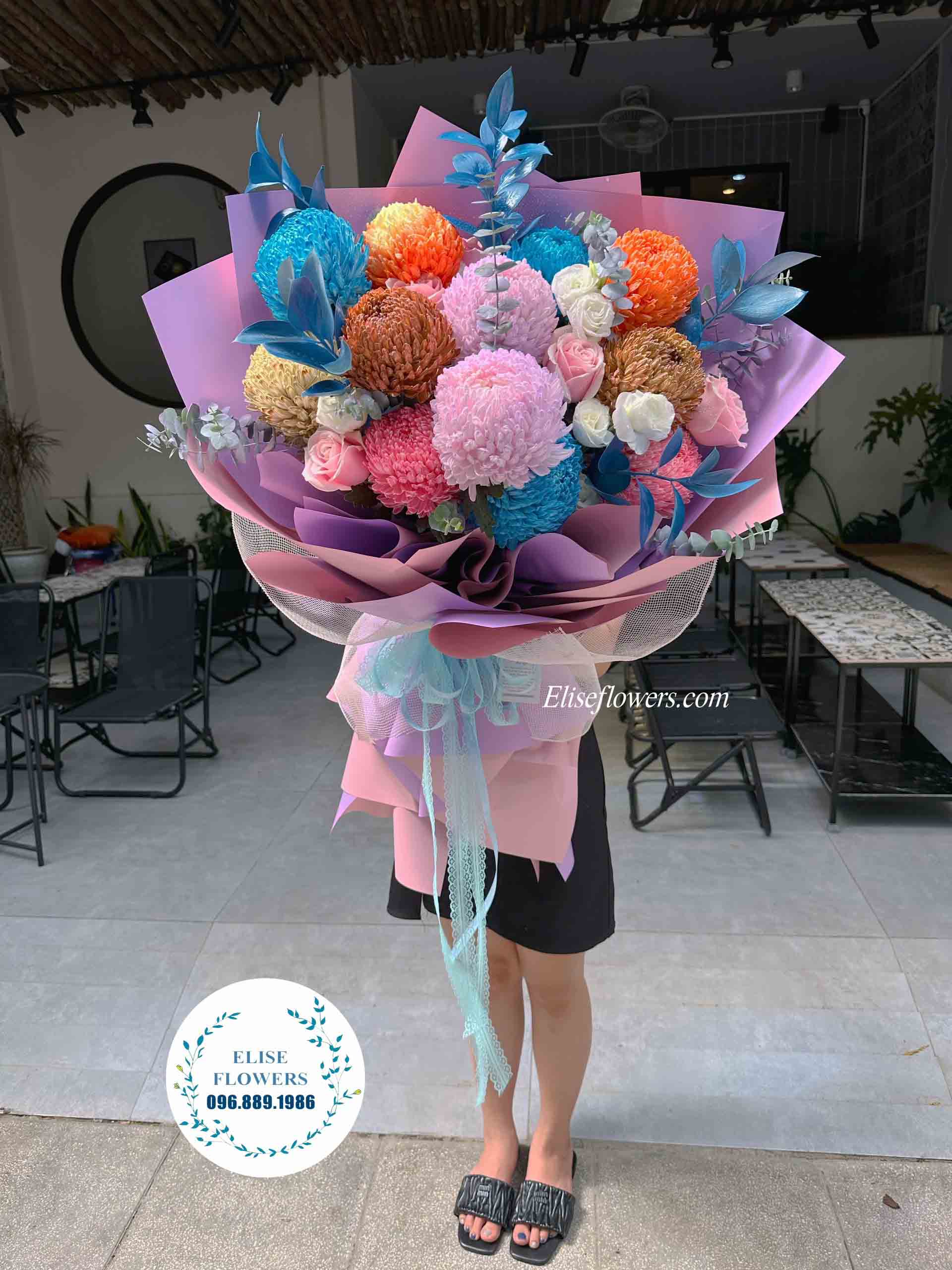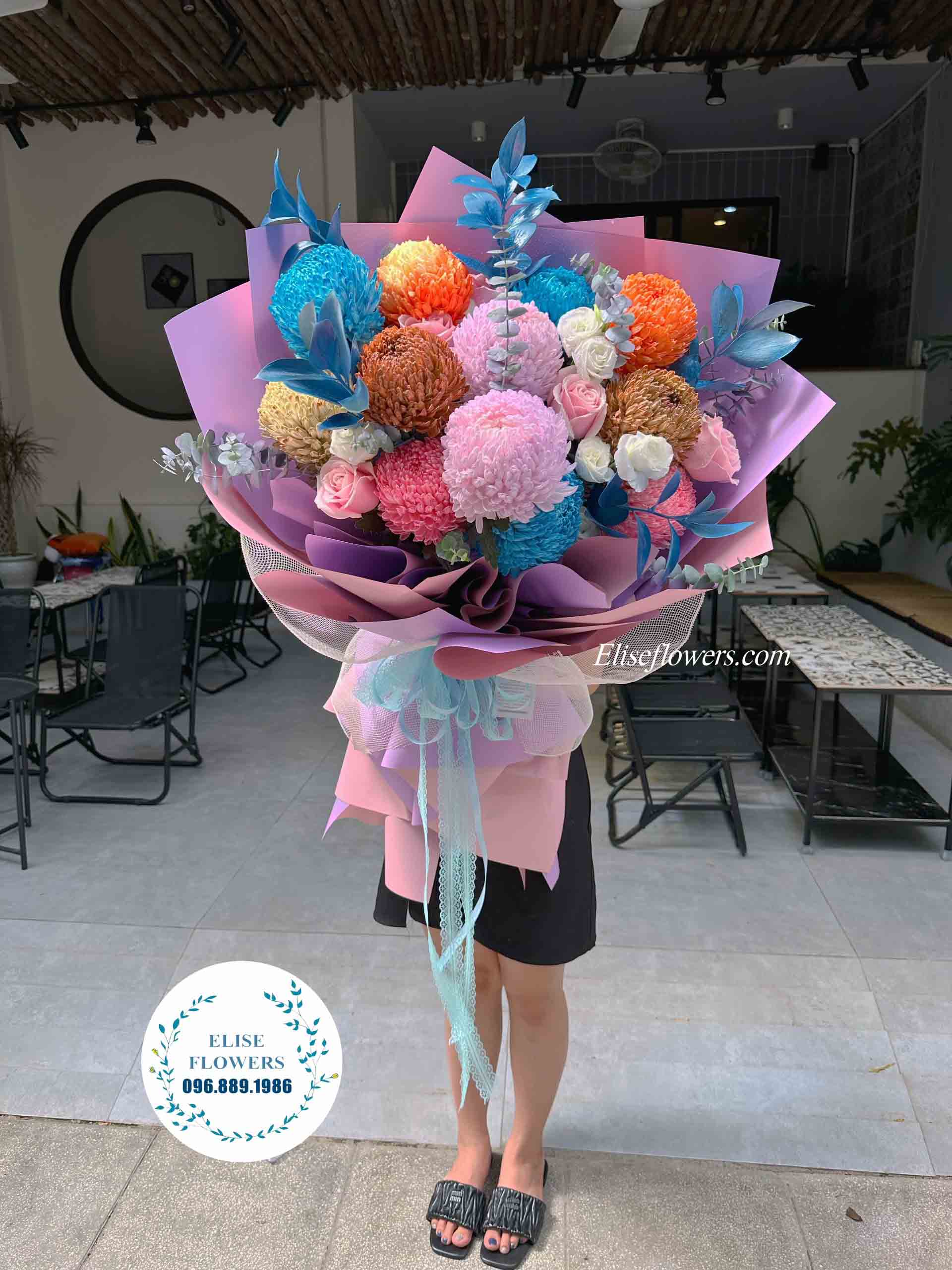 Hãy tưởng tượng xem các nàng sẽ vỡ oà cảm xúc như thế nào khi bất ngờ được ôm Bó hoa cúc mẫu đơn nhiều màu khổng lồ.