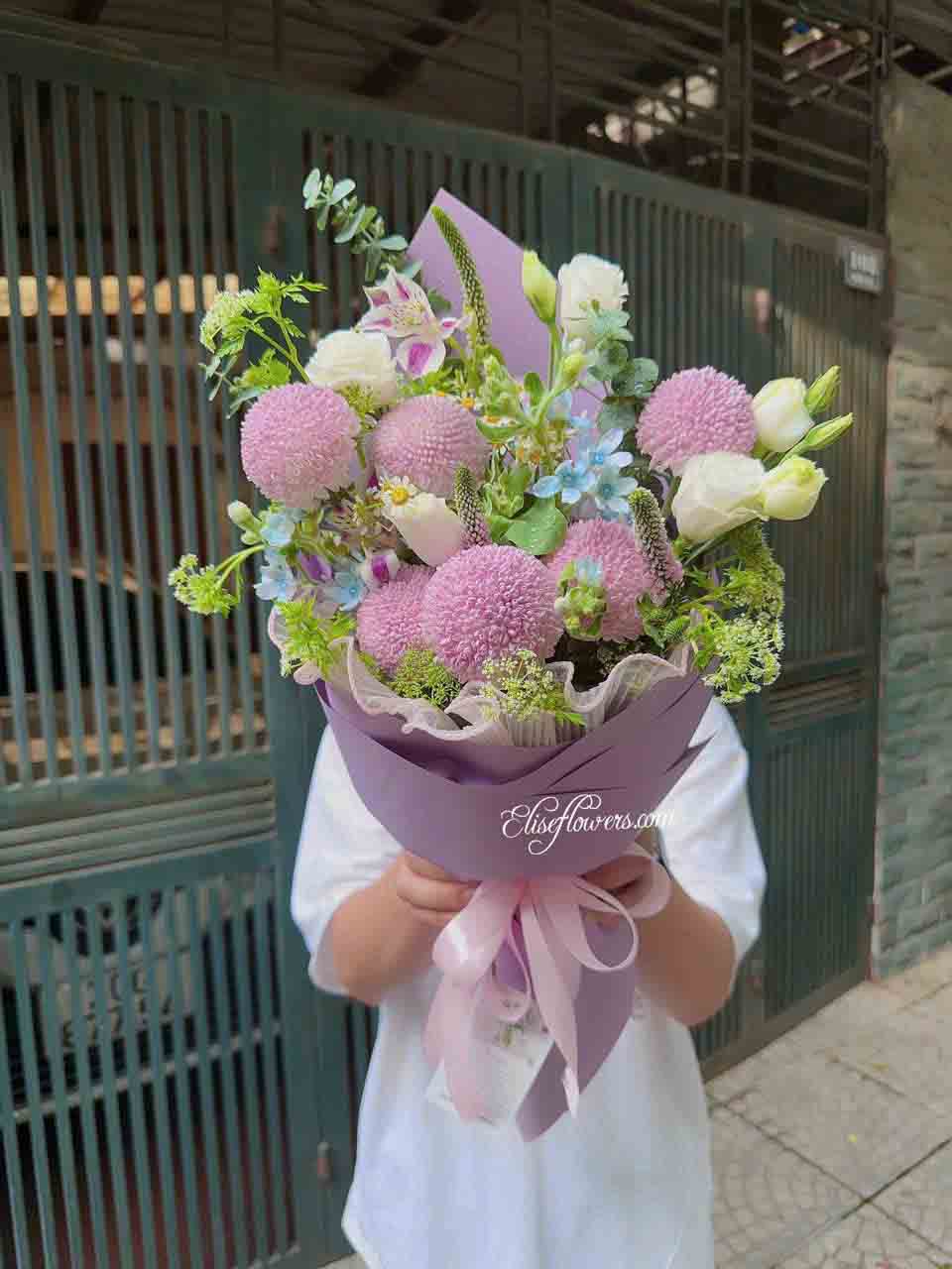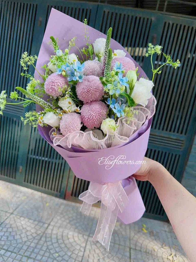 Bó hoa cúc ping pong hồng tím được tạo nên bởi những đóa hoa cúc pingpong hồng tím ngọt ngào làm chủ đạo kết hợp với hoa cúc tana, hoa sao xanh, hoa lan tường trắng và một số phụ kiện trang trí kèm theo khác như giấy gói, lưới nơ trang trí.