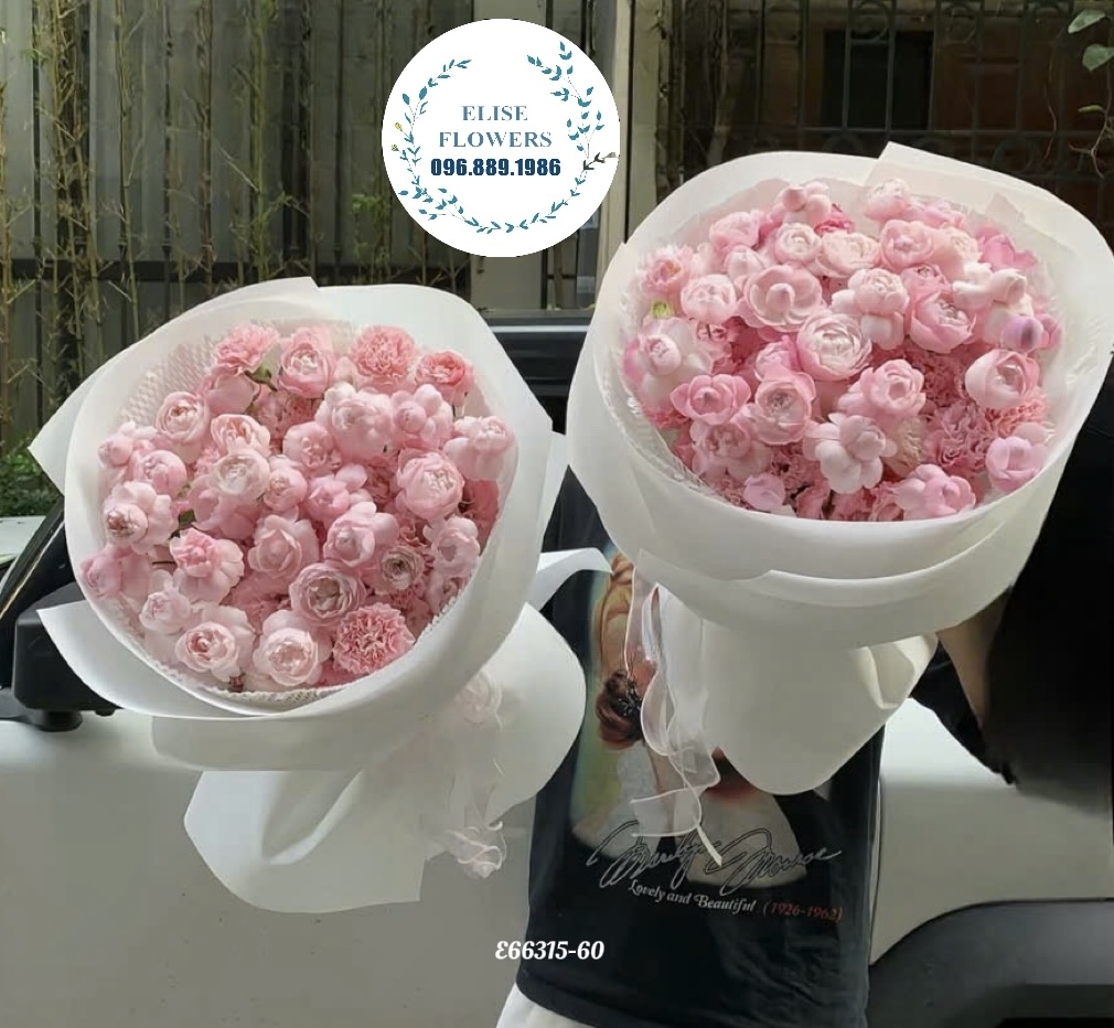Phong Cách Giấy Gói Hiện Đại: Tại Elise Flowers, bó hoa được phối cùng giấy gói cao cấp tone trắng hoặc hồng nhạt, làm nổi bật lên nét tinh khôi của từng đóa hoa.