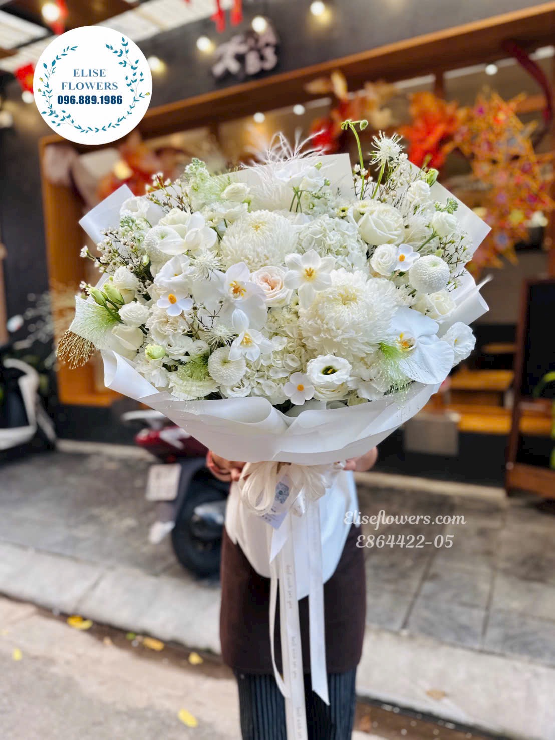 Bó hoa này được thiết kế theo phong cách sang trọng và thanh lịch, sử dụng hoàn toàn tone màu trắng làm chủ đạo. Sự kết hợp của nhiều loại hoa khác nhau tạo nên một tổng thể đầy đặn, tinh tế và thu hút.