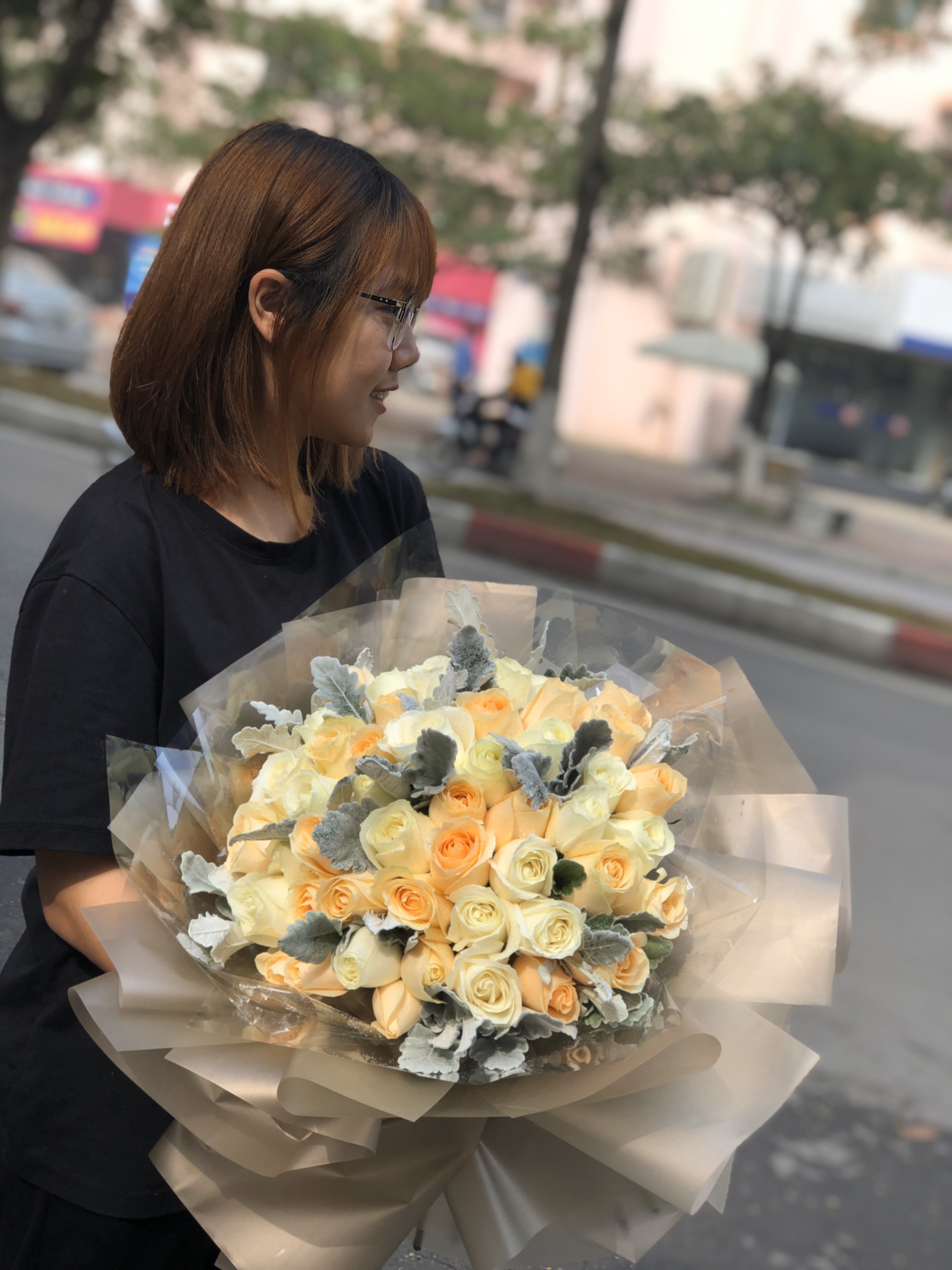 Bên ngoài, Elise Flower sử dụng giấy gói hoa màu xám nâu nhám, quả thực khi kết hợp chung với bó hoa hồng vàng và lá nhập khẩu này sẽ mang đến sự tinh tế huyền ảo đến lạ kỳ.