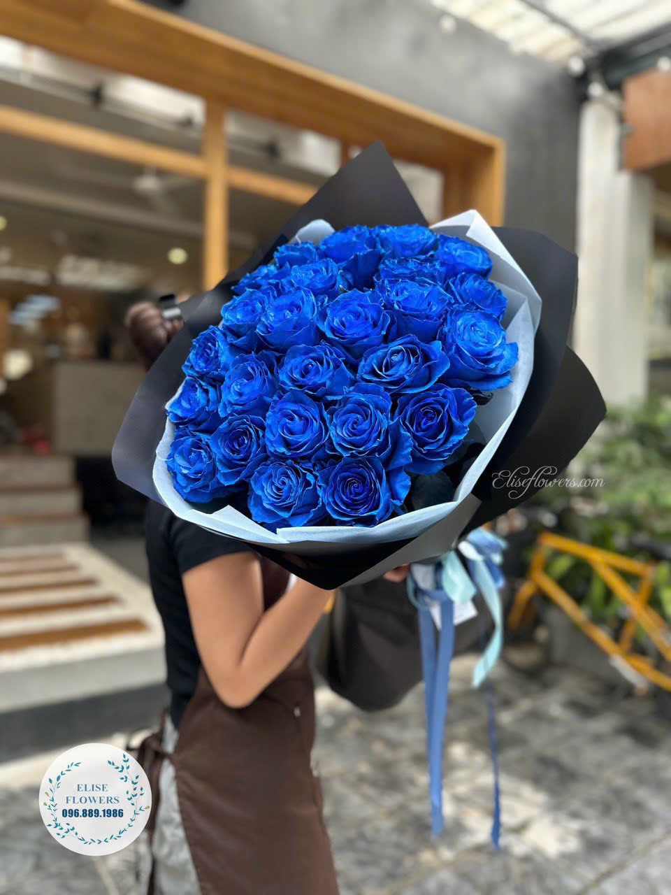 BÓ HOA GỒM CÓ: 25 BÔNG HOA HỒNG XANH ECUADOR ĐẠI ĐOÁ NHẬP KHẨU HOÀN TOÀN. Mẫu hoa được bó đơn giản với giấy gói màu đen để tone lên vẻ đẹp của hoa hồng Ecuador.