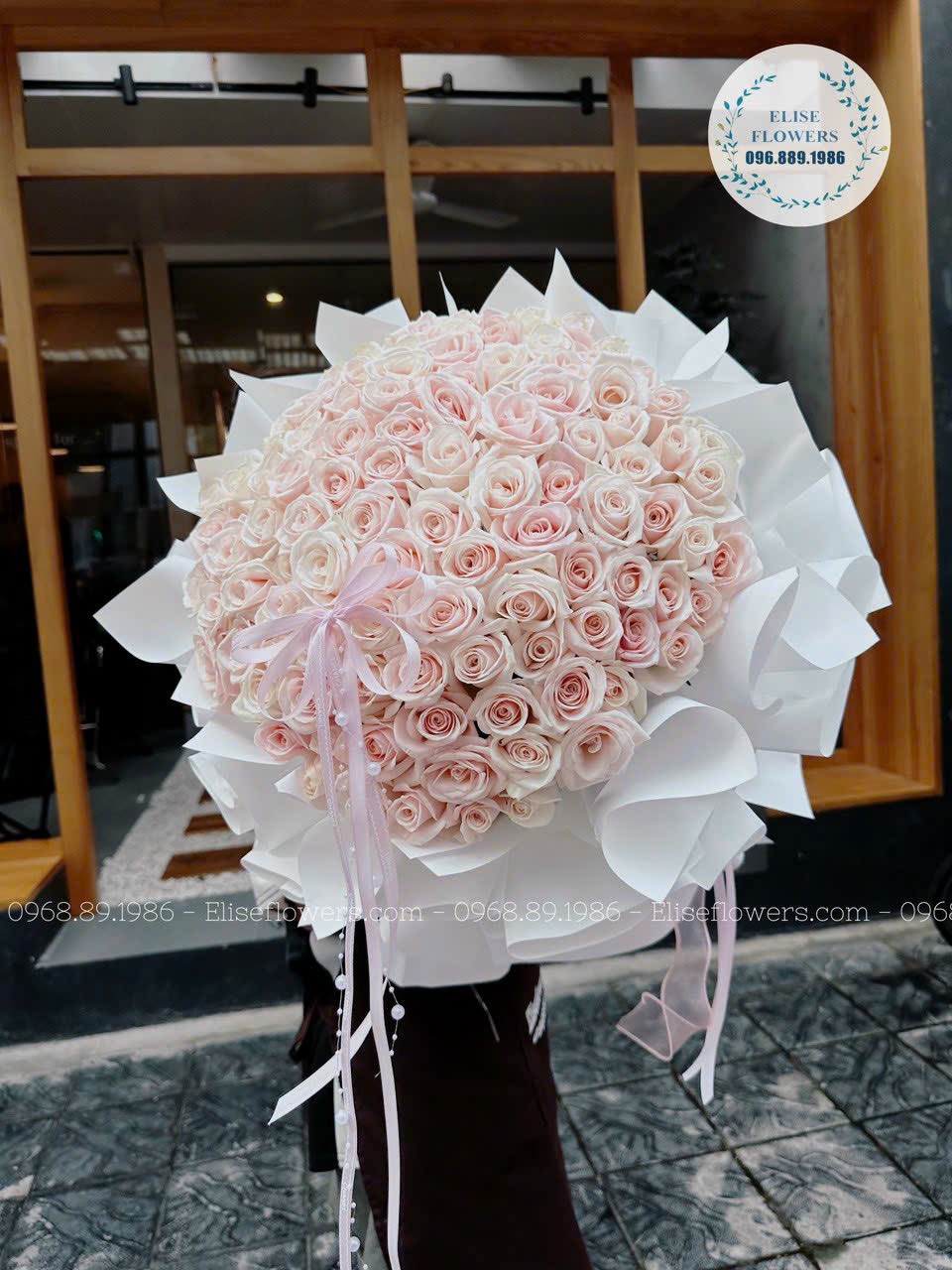 Bó hoa được thiết kế đơn giản, chỉ gồm 100 bông hoa hồng kem dâu ngọt ngào bó toả tròn đầu đặn. Điểm nhấn của bó hoa là chiếc nơ lụa Hàn mix cùng ngọc trai tinh tế. Bên ngoài là lớp giấy gói tone trắng xoè ra như chiếc váy bồng bềnh, điệu đà. Đây chắc chắn sẽ là mẫu hoa phù hợp nhất cho cô gái của bạn nhân dịp sinh nhật sắp tới.