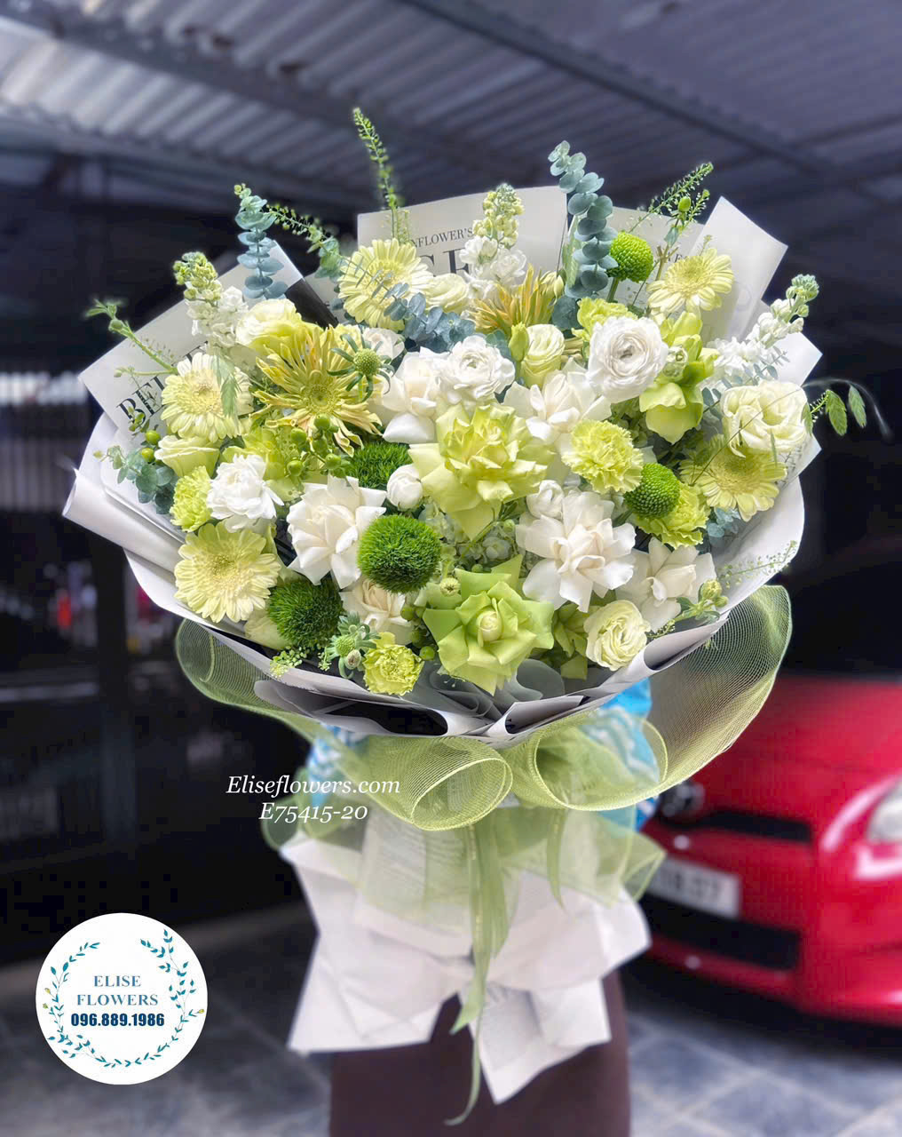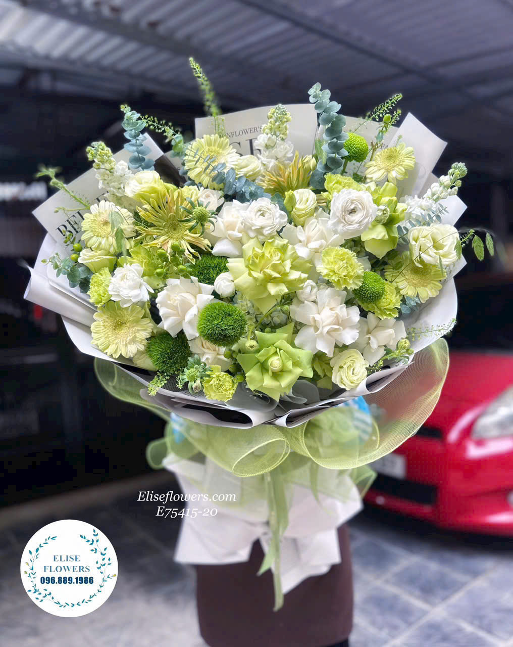 Bó hoa tone xanh lá được thiết kế dựa trên ý tưởng về sự tươi mới và thịnh vượng. Với sự kết hợp tinh tế giữa sắc xanh chủ đạo của lá và những bông hoa cao cấp như hoa đồng tiền xoăn, hoa hồng xanh, cẩm tú cầu, và các loại lá phụ trang nhã, bó hoa mang đến vẻ đẹp hiện đại, thanh lịch và không kém phần nổi bật.