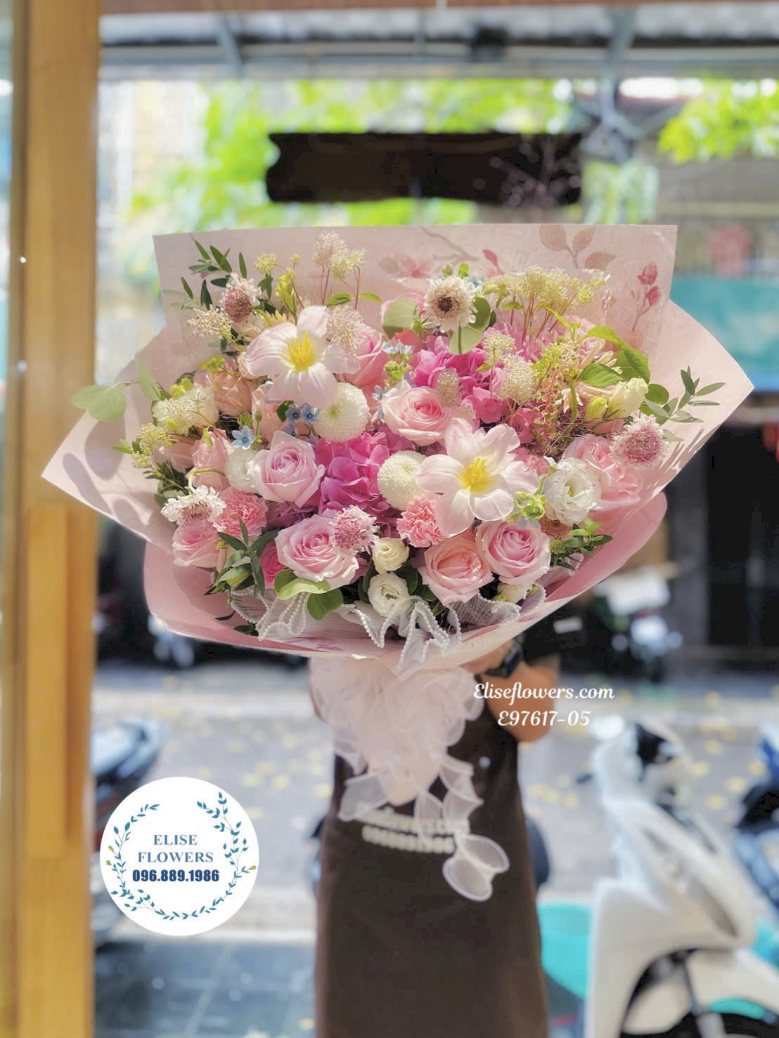 Bó hoa tone hồng ngọt ngào đến từ Eliseflowers Ba Đình là sự kết hợp hoàn hảo giữa các loại hoa. Với hoa hồng làm chủ đạo, bó hoa còn được điểm xuyết bởi Tulip, cẩm chướng, hoa sao, hoa baby và nhiều loại hoa phụ khác, tạo nên một tổng thể hài hòa và đầy lãng mạn.