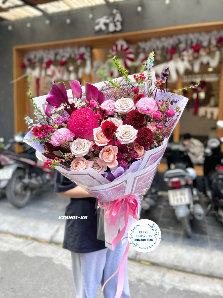 + Tông Màu: Tập trung vào sự pha trộn đa sắc của Hồng Đậm, Hồng Nhạt, Tím Đỏ Nhung và các loại lá phụ màu xanh bạc/xanh rêu, tạo nên một bó hoa có chiều sâu và sự quyến rũ.