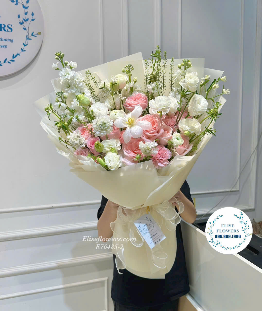 Được kết hợp hài hòa giữa các loại hoa cao cấp, bó hoa tone hồng trắng E76485-2 không chỉ đẹp mắt mà còn tinh tế, trang nhã, thể hiện sự chu đáo của bạn dành cho cô ấy. Đây không chỉ là một bó hoa mà là món quà hoàn hảo cho mọi dịp, từ sinh nhật, kỷ niệm, hay đơn giản là để tạo niềm vui bất ngờ.