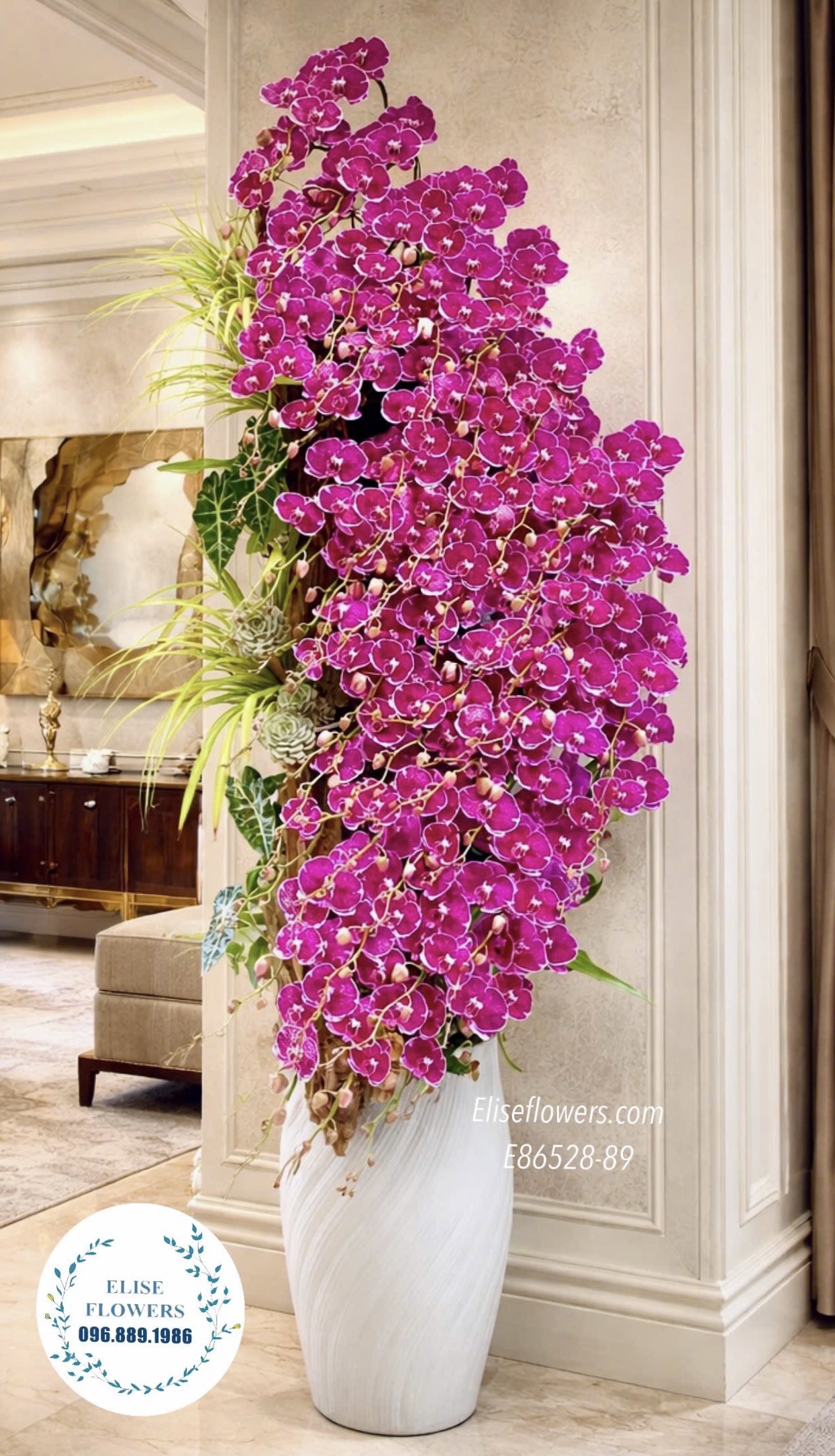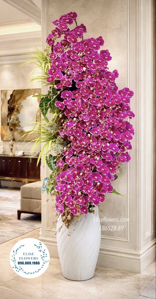 Thiết Kế Dòng Thác Đổ Uy Nghi: Những nhành lan tím đại được uốn lượn mềm mại, đổ xuống tựa như dòng thác tài lộc cuồn cuộn, mang lại vượng khí cho không gian đại sảnh.