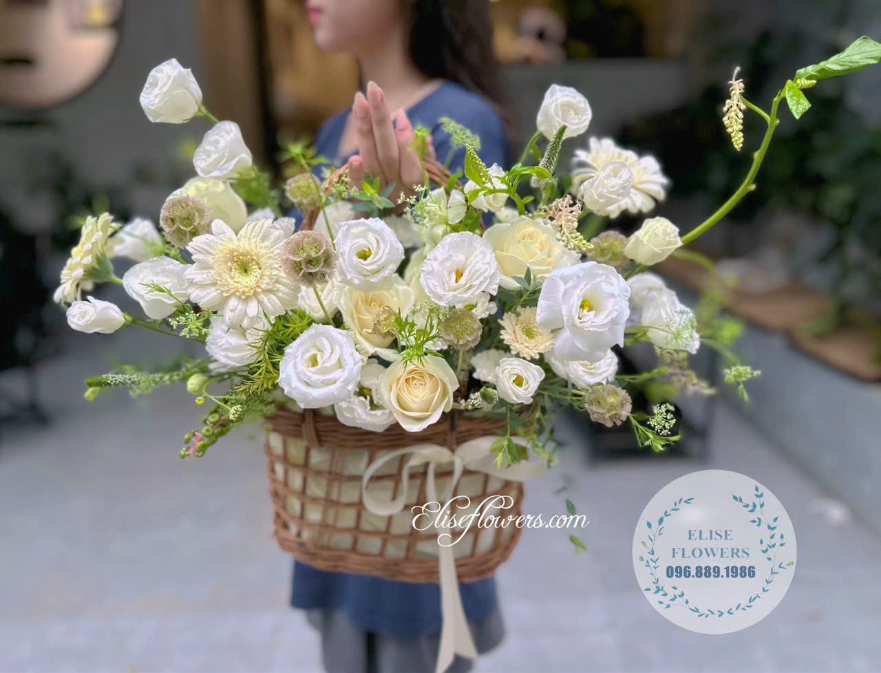 Giỏ hoa sinh nhật màu trắng kem nhỏ xinh | Giỏ hoa tươi chúc mừng sinh nhật đẹp ở quận Hoàn Kiếm