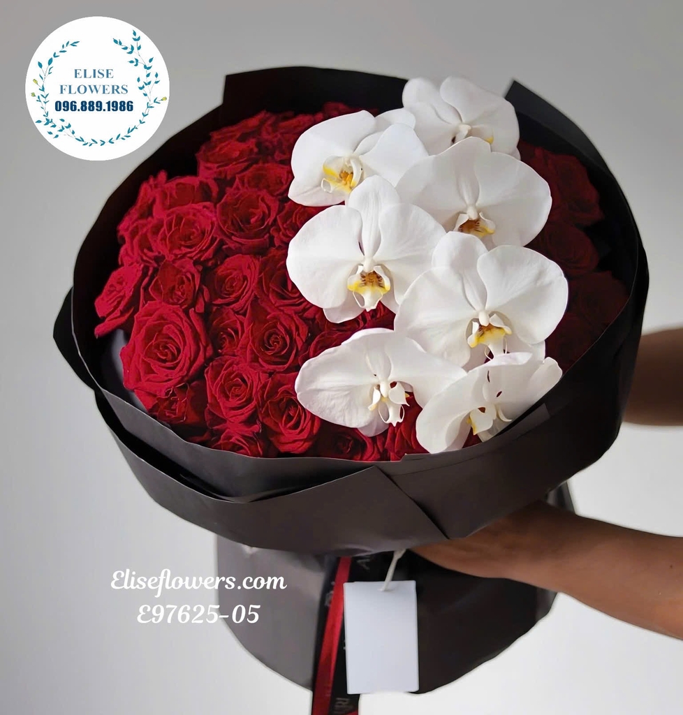 Thiết kế sáng tạo: Sự tương phản giữa màu đỏ rực rỡ của hoa hồng và màu trắng thuần khiết của lan hồ điệp tạo nên một hiệu ứng thị giác mạnh mẽ, đầy cuốn hút. Bó hoa được bó tròn, gói bằng giấy màu đen tuyền để làm nổi bật màu sắc của hoa.
