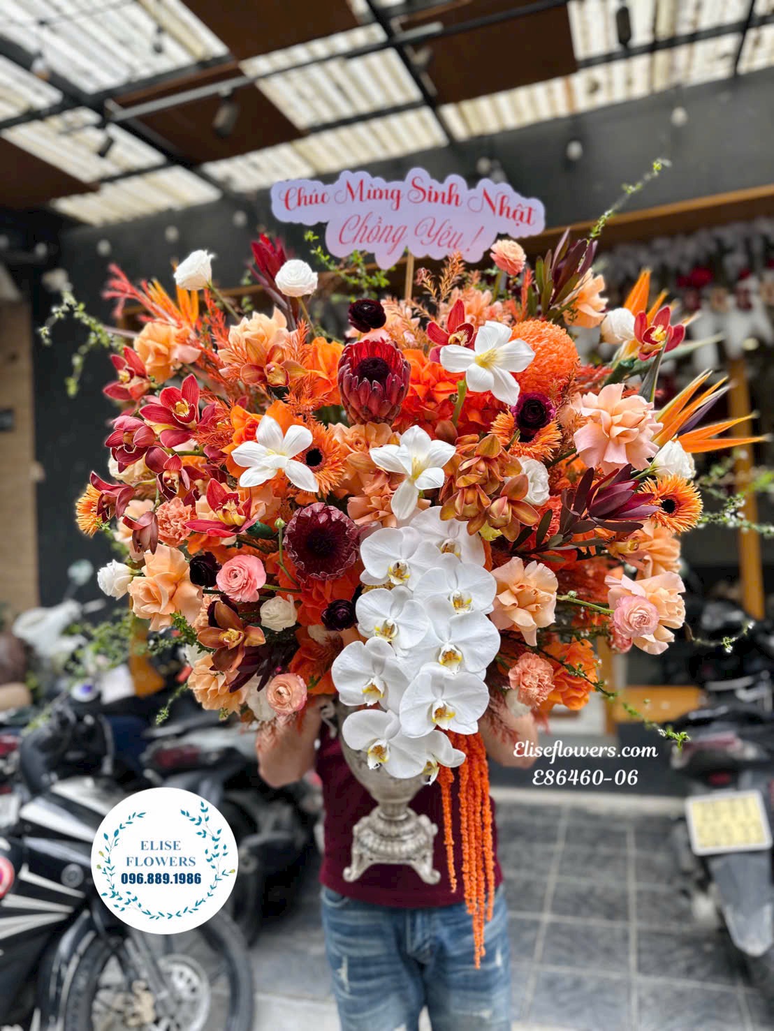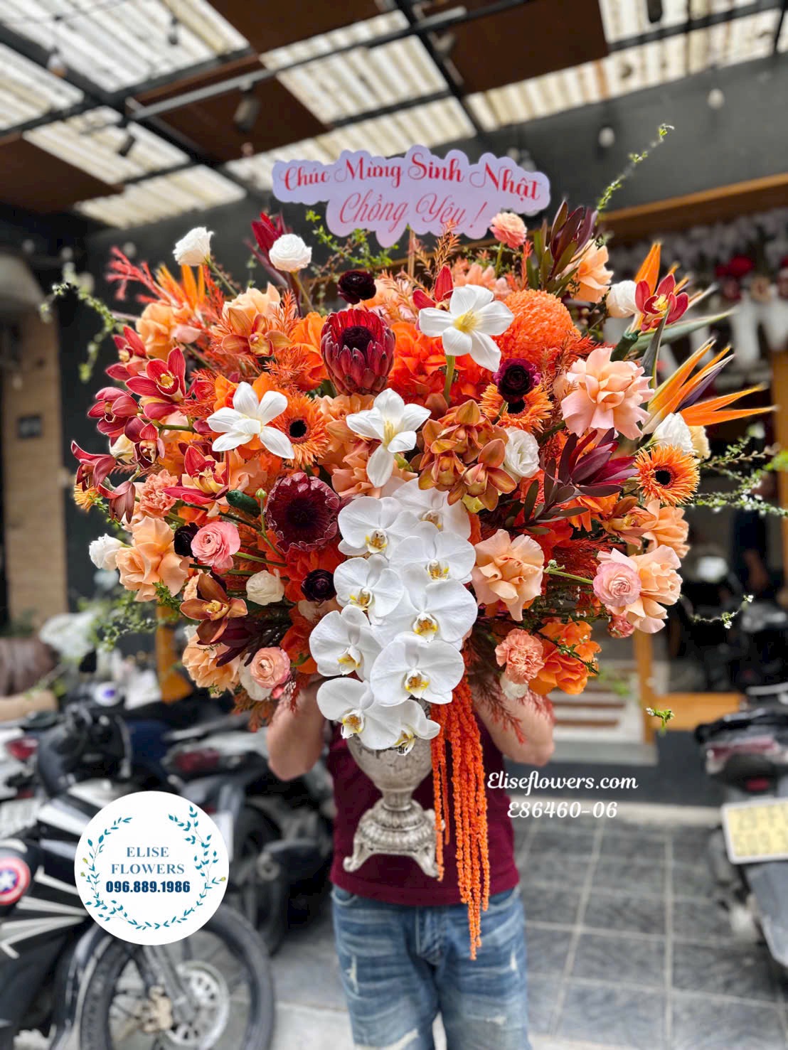 Bình Hoa Tone Cam Sang Trọng tại Eliseflowers là tác phẩm nghệ thuật đỉnh cao, được thiết kế riêng để Chúc Mừng Cao Cấp các sự kiện lớn và tôn vinh những người có vị thế quan trọng như Sếp, Lãnh đạo, hoặc Đối tác kinh doanh. Sự kết hợp mạnh mẽ giữa Tone Cam Đỏ Rực Rỡ và Lan Hồ Điệp Trắng thanh cao tạo nên một thiết kế hoành tráng, quyền lực và không thể trộn lẫn.