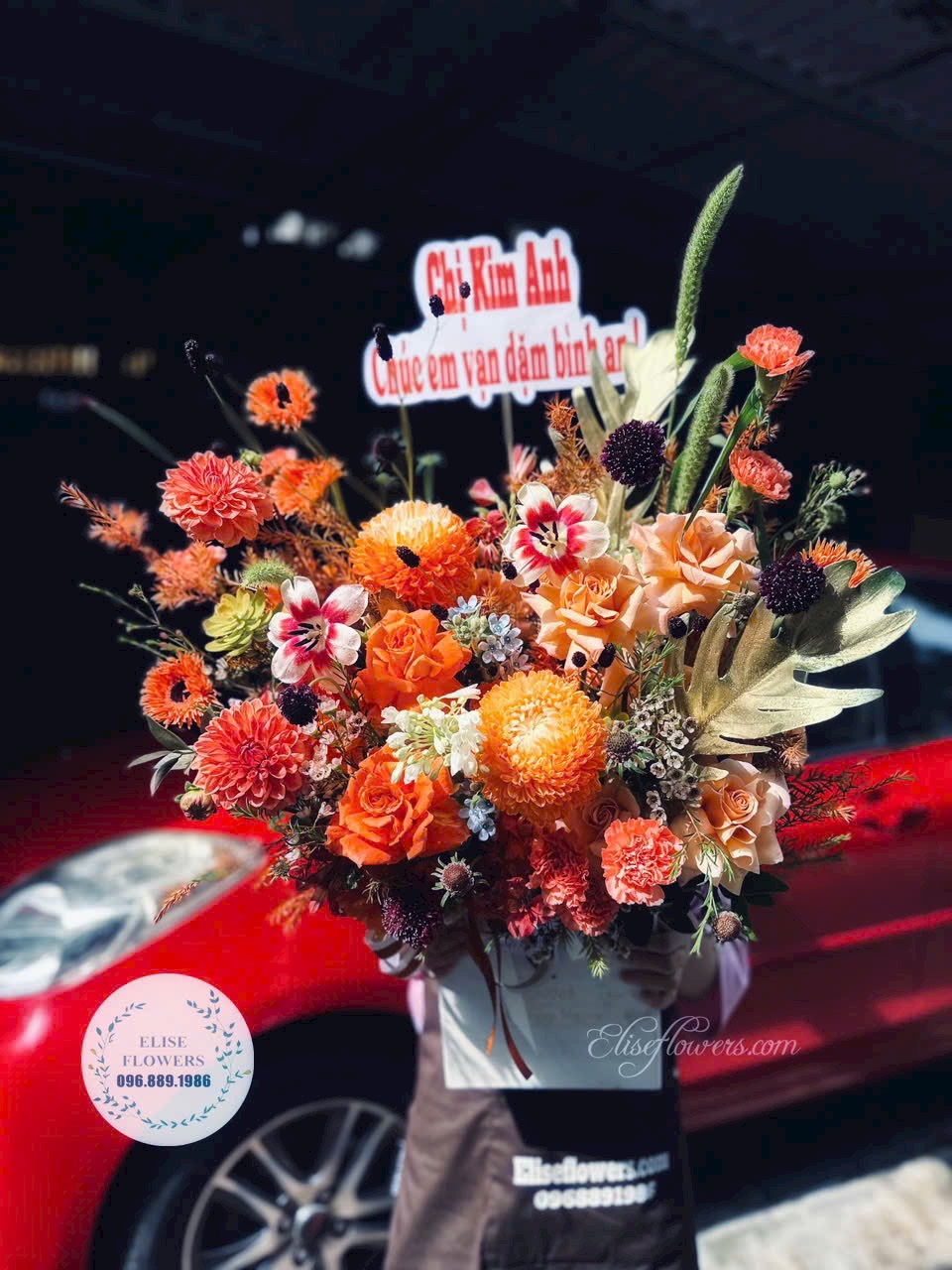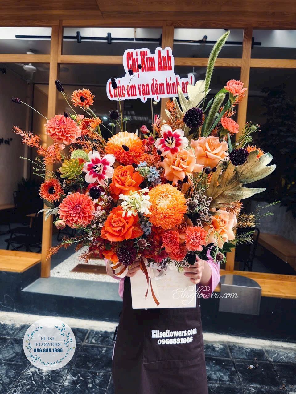 Eliseflowers xin giới thiệu đến quý khách hàng mẫu lẵng hoa khai trương màu cam tây sang chảnh, hiện đại. Mẫu hoa là thiết kế mới nhất tại Tiệm hoa với các loại hoa nhập khẩu cao cấp như:
