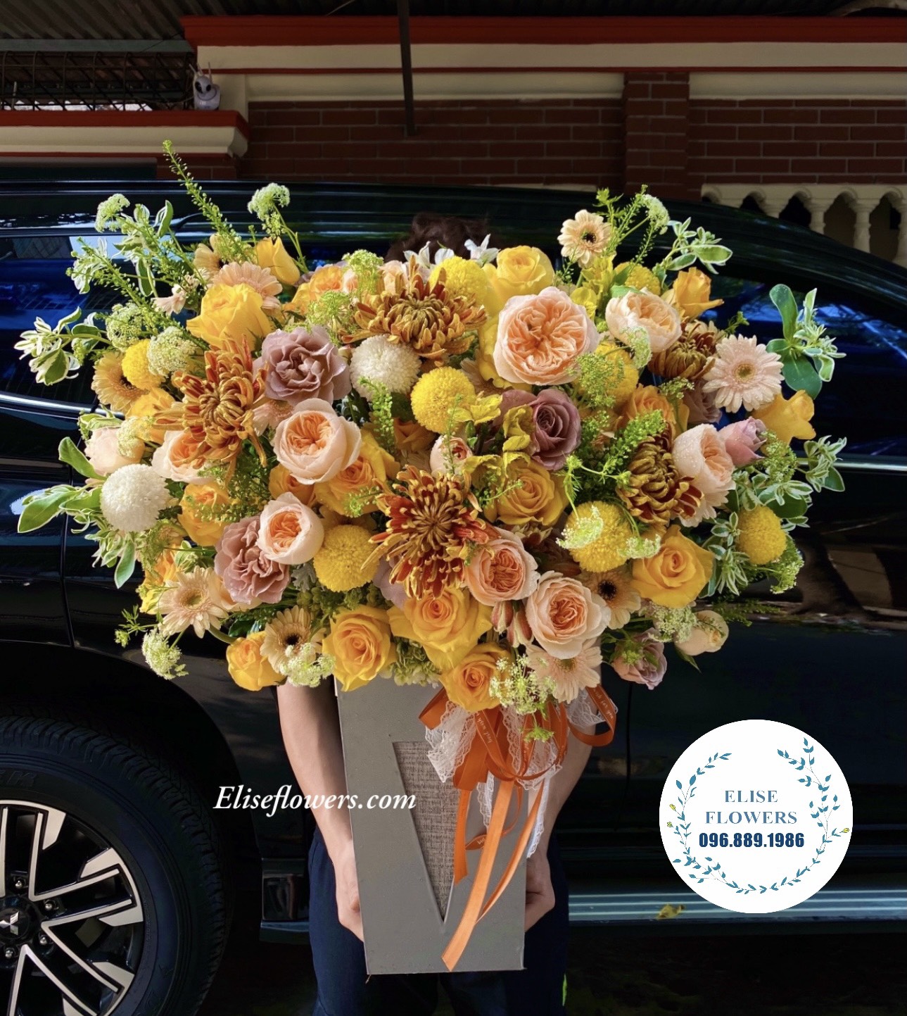 Hộp hoa để bàn chúc mừng tân gia | Hộp hoa mix hoa nhập khẩu đẹp tại Eliseflowers