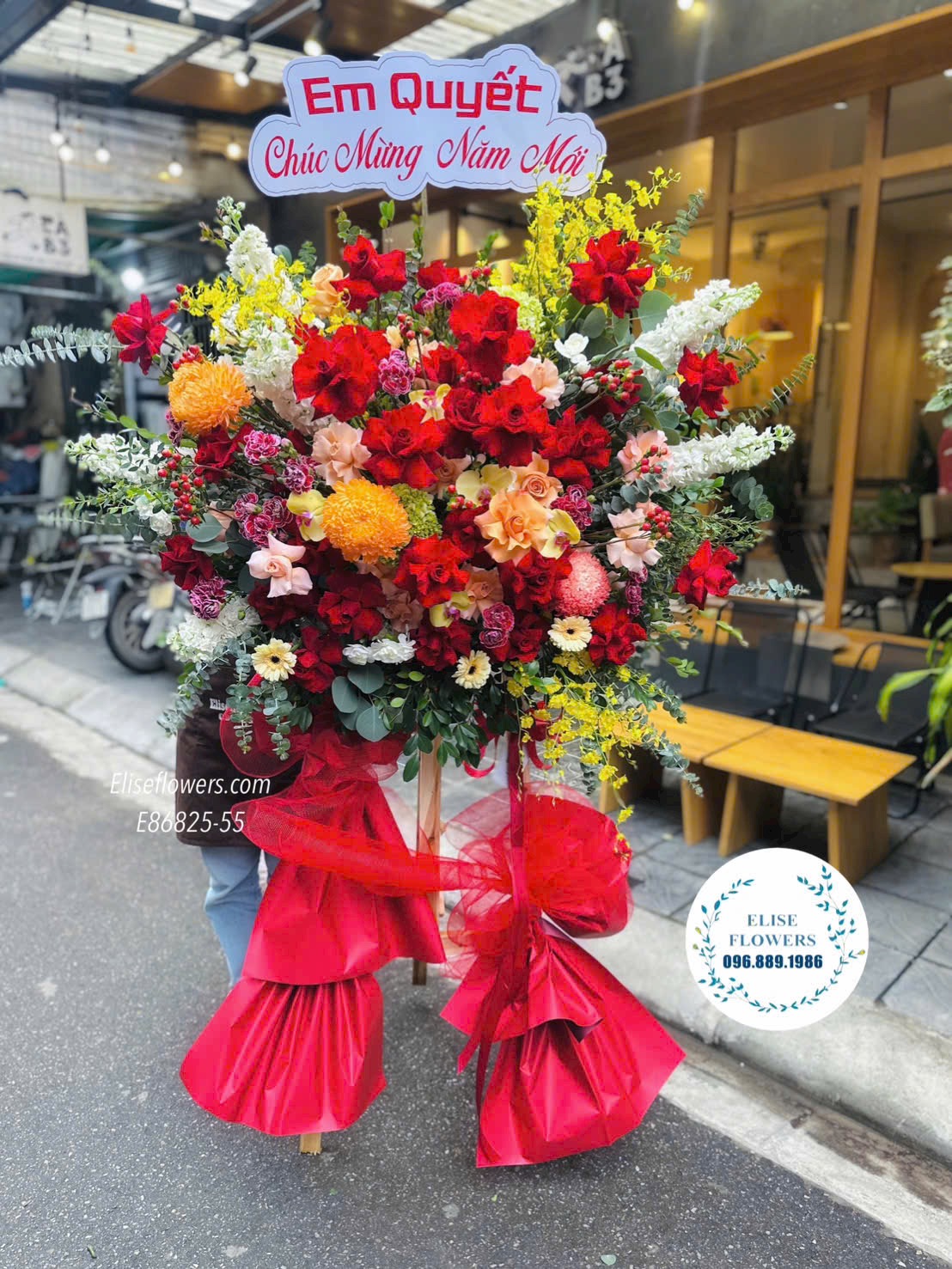 Kệ hoa chúc mừng năm mới. Hoa chúc mừng đỏ mừng year end party sang trọng, cao cấp. Eliseflowers