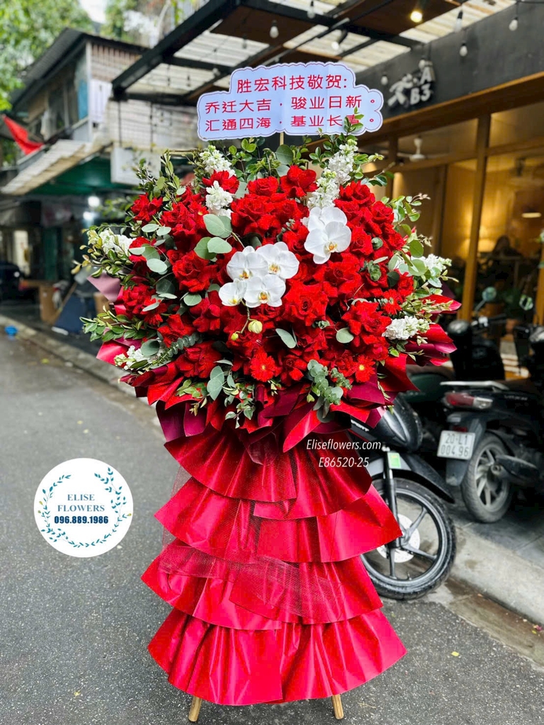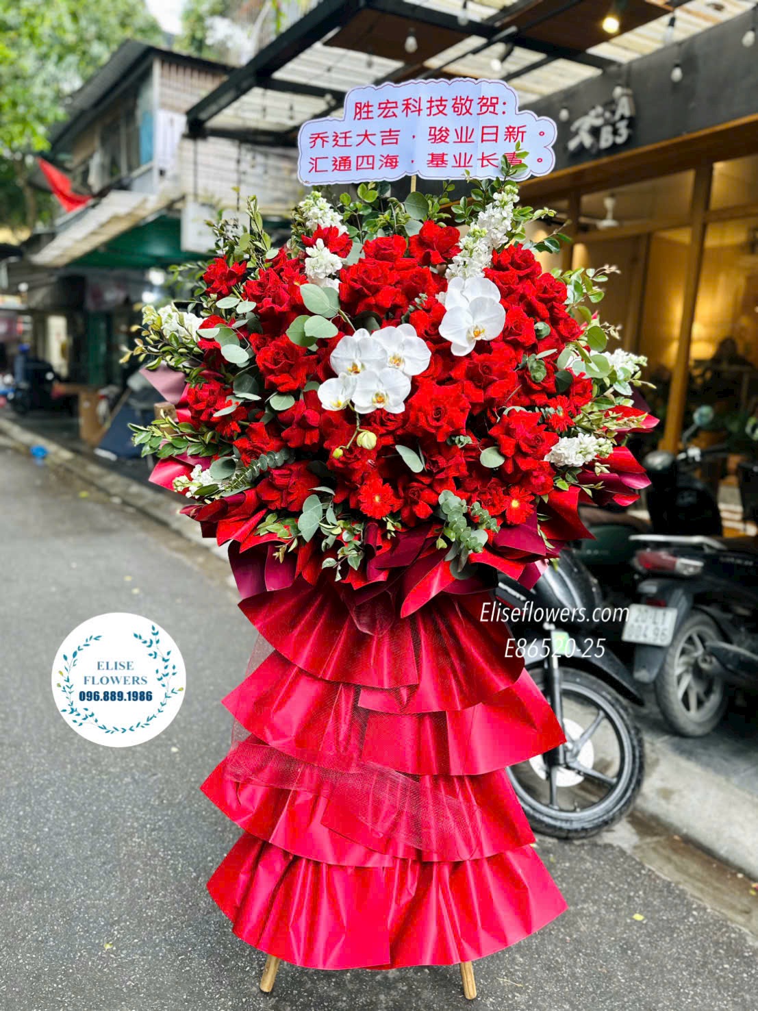 Kệ hoa tone đỏ rực rỡ. Hoa chúc mừng sinh nhật công ty, khai trương. Điện hoa uy tín Eliseflowers