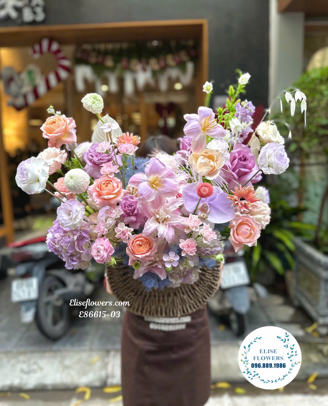 Thiết Kế Độc Đáo: Lẵng hoa tone Tím được thiết kế riêng và bắt trend xu hướng mới nhất