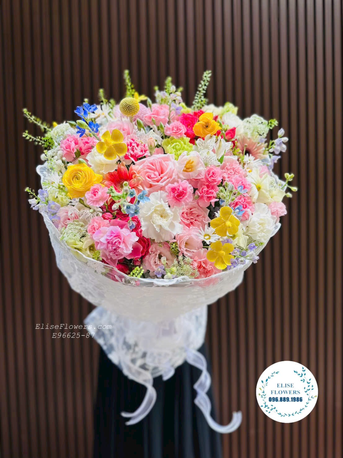 • Thông điệp ý nghĩa: Mỗi loài hoa trong bó đều mang một ý nghĩa riêng, tượng trưng cho tình yêu chân thành, sự trân trọng và những lời chúc tốt đẹp nhất dành cho người nhận.