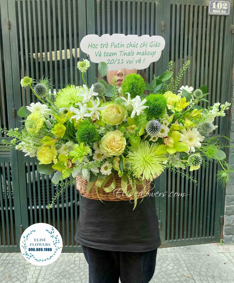 Giỏ hoa tươi nhập khẩu phong cách Garden | Giỏ hoa tone xanh lá thơ thẩn