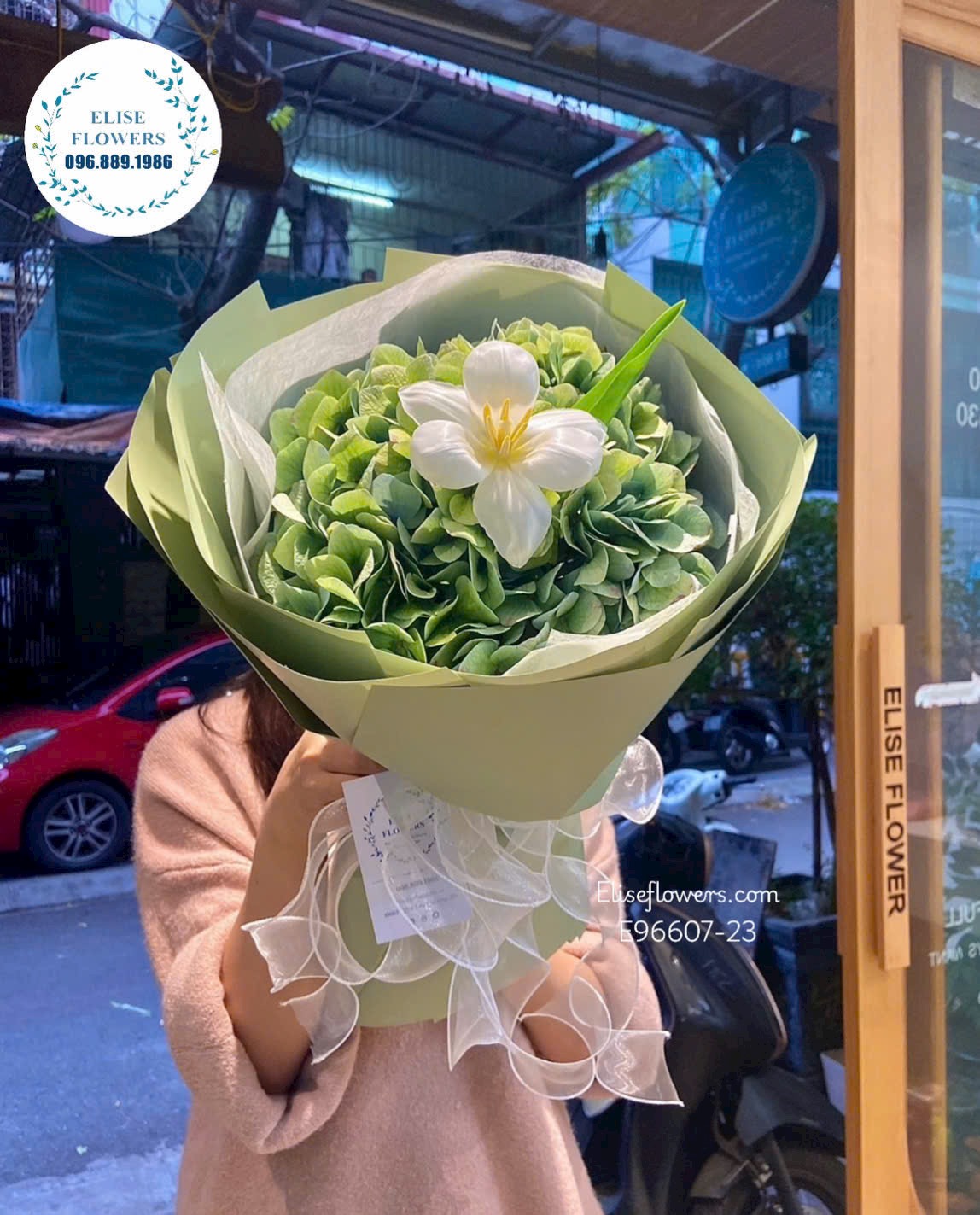 Trung tâm bó hoa là khối Cẩm Tú Cầu màu xanh lá cây non, loài hoa nổi tiếng với ý nghĩa về sự chân thành, lòng biết ơn và mong muốn được tha thứ. Màu xanh dịu dàng của cẩm tú cầu mang đến cảm giác bình yên, xoa dịu những căng thẳng. Điểm nhấn hoàn hảo nằm ở một bông Tulip trắng duy nhất đặt giữa trung tâm, biểu tượng cho sự trong sáng, khởi đầu mới và lời cam kết về một tương lai tốt đẹp hơn.