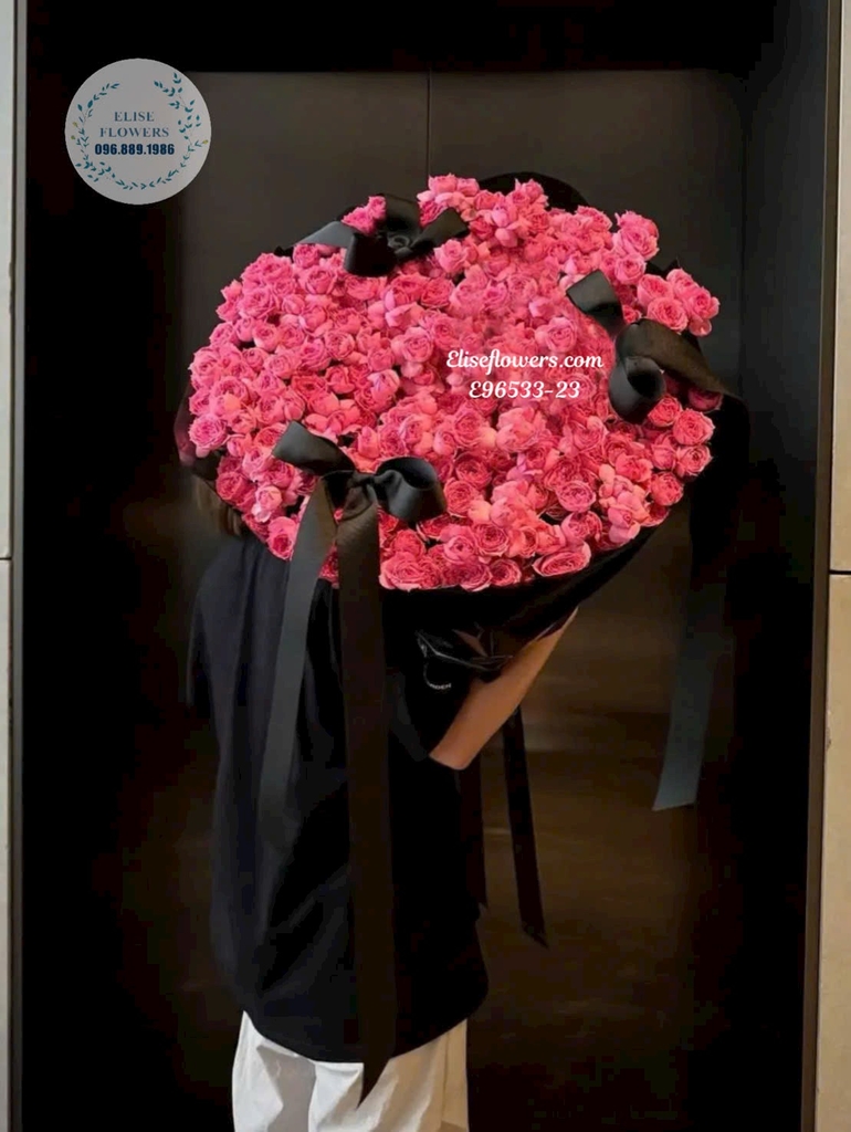 Thiết kế Lãng Mạn: Bó hoa được bó theo phong cách bo tròn, gói bằng giấy màu đen cùng nơ đen huyền bí làm tôn lên sắc hồng đậm của hoa. Thiết kế này mang đến cảm giác ngọt ngào, lãng mạn, hoàn hảo cho dịp tặng sinh nhật người thương.