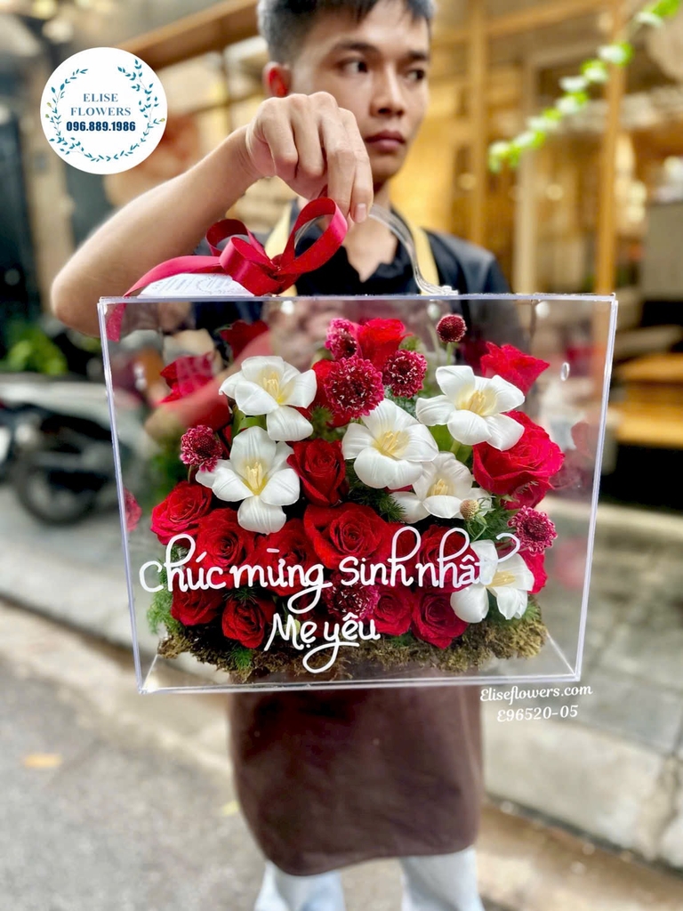 Hộp Mica Độc Đáo: Khác với bó hoa truyền thống, hộp mica trong suốt giúp tôn lên vẻ đẹp của hoa và mang lại sự sang trọng, hiện đại.