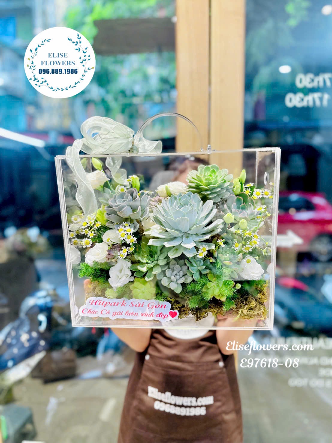Hộp mica trong suốt – Sang trọng và tinh tế: Lớp vỏ mica cao cấp giúp tôn lên vẻ đẹp tự nhiên của sen đá, đồng thời mang ý nghĩa minh bạch, thu hút năng lượng tích cực và tài lộc.