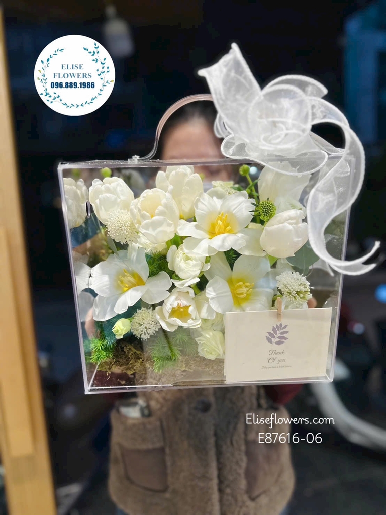 Hôp hoa kỉ niệm ngày cưới. Hộp mIca trong suốt tặng vợ yêu. Điện hoa tươi Eliseflowers