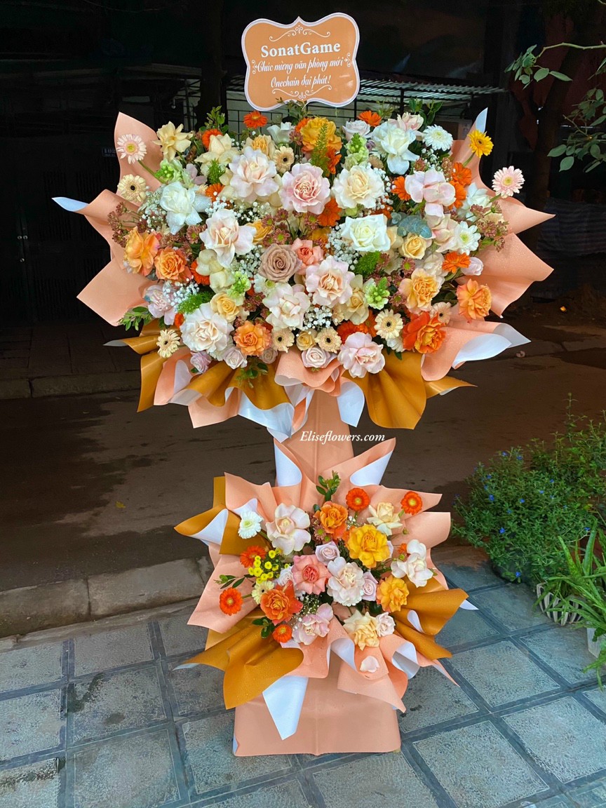Mẫu Kệ hoa chúc mừng khai trương tone màu cam sang trọng. Kệ hoa 2 tầng chúc mừng khai trương ở Hà Nội. Hoa khai trương cao cấp tại Hà Nội. Dịch vụ đặt hoa khai trương - Giao hoa tận nơi nhanh chóng