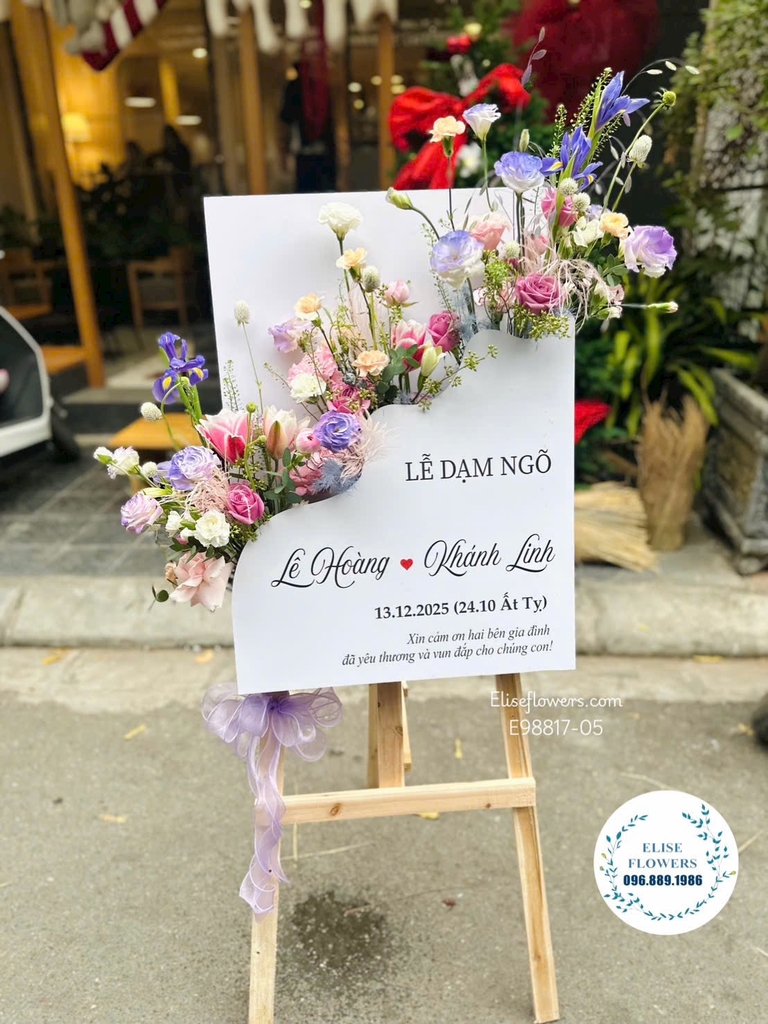 Lễ dạm ngõ là nghi thức quan trọng mở đầu cho hành trình hạnh phúc của các cặp đôi. Để buổi gặp mặt giữa hai bên gia đình thêm phần ý nghĩa và tinh tế, mẫu Kệ Hoa Dạm Ngõ Hiện Đại từ Eliseflowers là sự lựa chọn không thể bỏ qua. Với thiết kế dạng bảng thông tin kết hợp hoa tươi, sản phẩm không chỉ là vật trang trí mà còn là điểm nhấn sang trọng, thể hiện sự chỉn chu và lòng trân trọng của đôi bạn trẻ dành cho ngày trọng đại của mình.