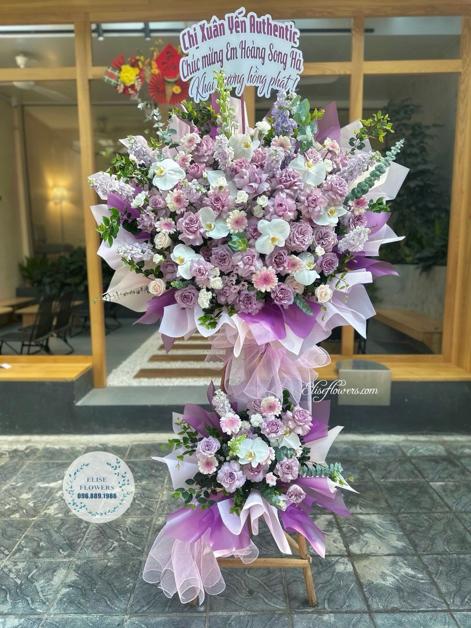 - Kệ hoa mang màu tím chủ đạo, nó mang đến sắc thái mê huyền,khích thích sự sáng tạo của con người. Dù bạn đặt kệ hoa bất cứ nơi đâu vẫn nổi bật và ấn tượng. Ngoài ra màu tím tượng trưng cho quyền lực, danh vọng tối thượng và sự thịnh vượng của con người. Tặng hoa tím ngày khai trương là cầu mong danh vọng tiền tài cho gia chủ.