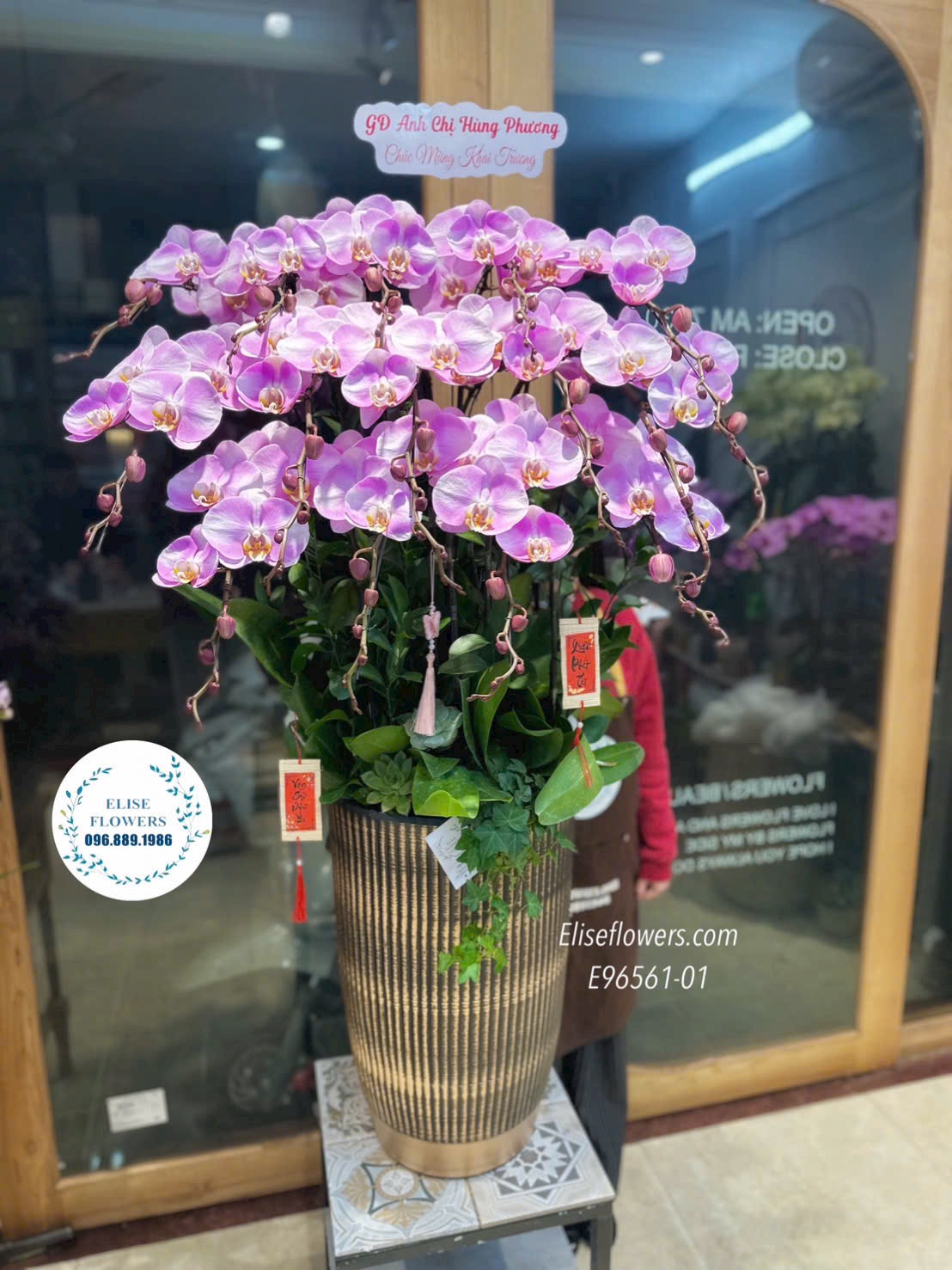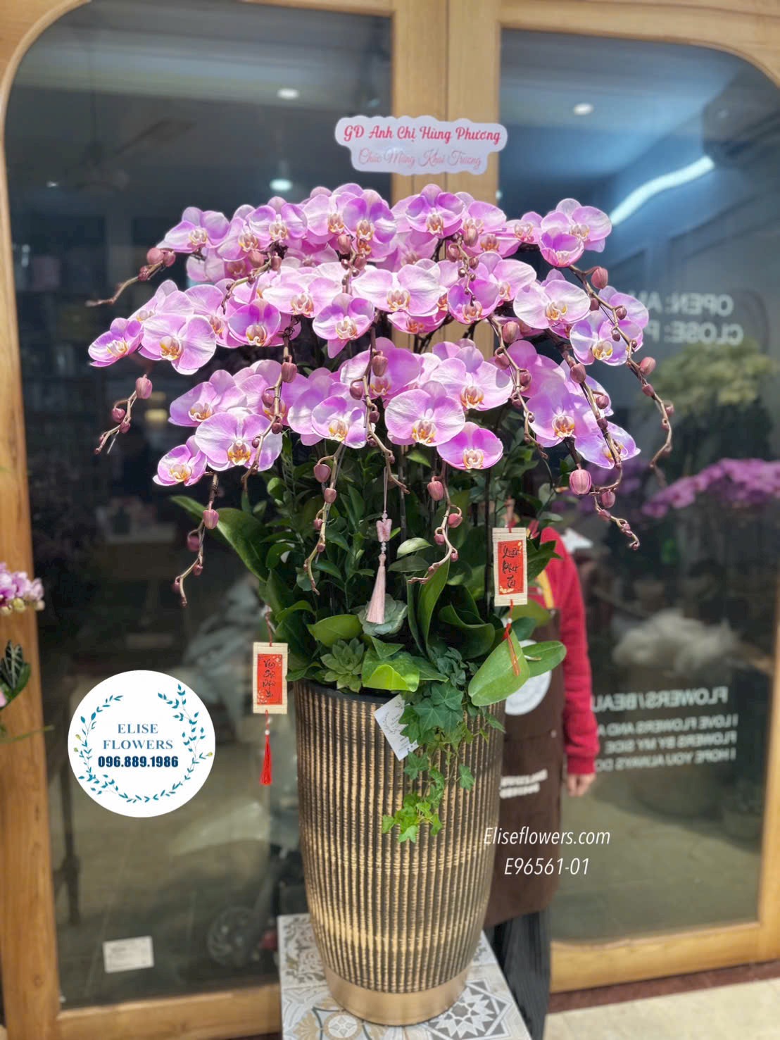 • Thiết Kế Dáng Cao Bề Thế: Chậu lan được nghệ nhân Eliseflowers cắm theo dáng vòm tỏa đều, các cành hoa vươn cao tràn đầy sức sống, mang lại sự uy nghi cho sảnh văn phòng hoặc phòng khách.
