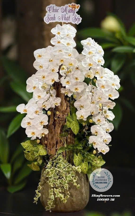 Chậu lan hồ điệp trắng ghép lũa độc đáo mừng sinh nhật tại Eliseflowers- Dịch vụ điện hoa tươi, lan hồ điệp uy tín số 1 tại Hà Nội