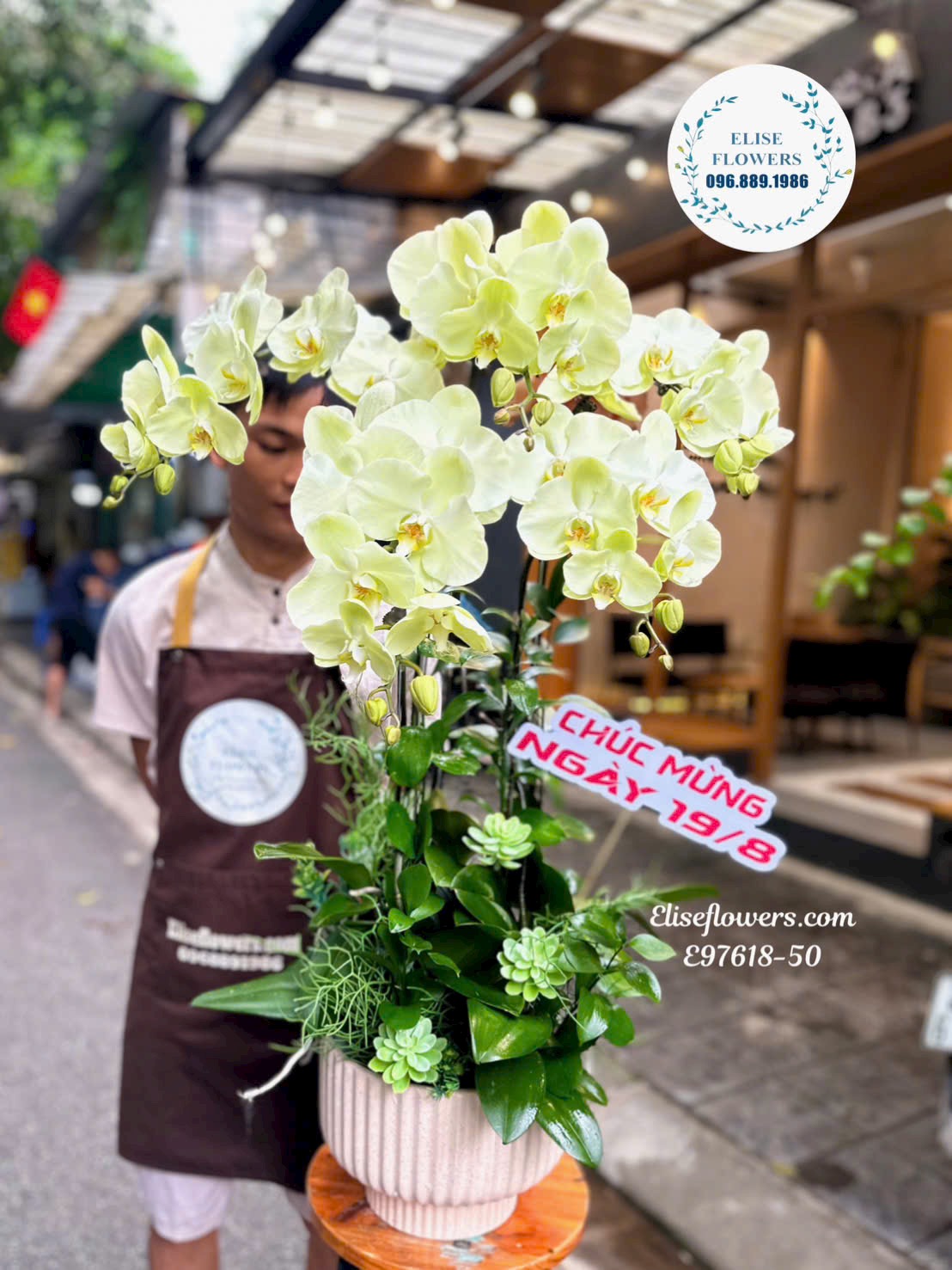 Thiết Kế Tinh Tế – Đẳng Cấp Vượt Trội: Mỗi cành lan được nghệ nhân của Elise Flowers cắm tỉ mỉ, kết hợp hài hòa cùng các loại cây lá xanh tươi, tạo nên một tổng thể cân đối, đẹp mắt từ mọi góc nhìn. Chậu cây được chọn lựa kỹ càng, không chỉ bền mà còn tôn thêm vẻ sang trọng cho món quà.