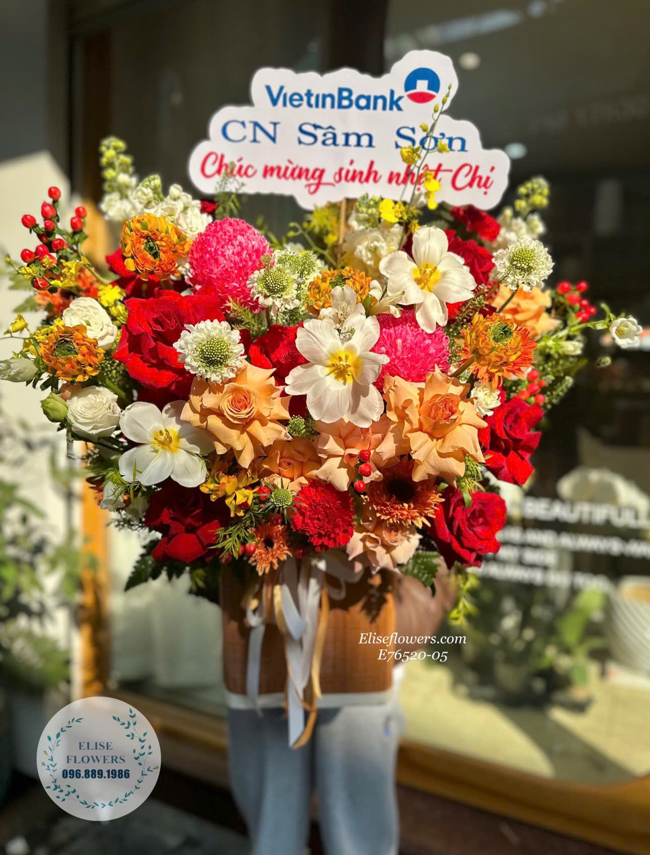 Lẵng hoa màu cam đỏ tinh tế, rực rỡ, sang trọng tặng sinh nhật sếp - Elise Flowers  -Shop hoa tươi Hà Nội.