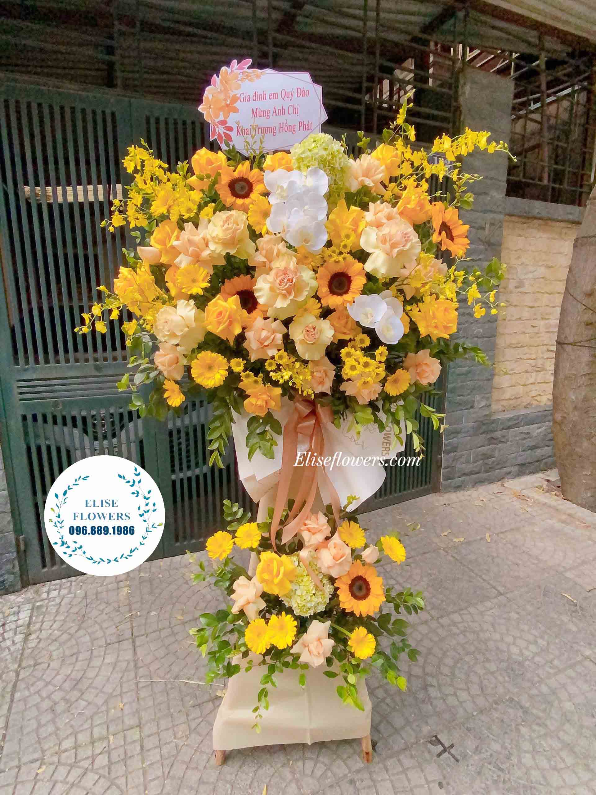 Sản phẩm lẵng hoa chúc mừng sự kiện màu vàng rực rỡ được các florist tiệm Elise thiết kế tỉ mỉ, khéo léo kết từng bông hoa thành một kệ hoa sang trọng với những bông hoa được tuyển chọn kĩ lưỡng :