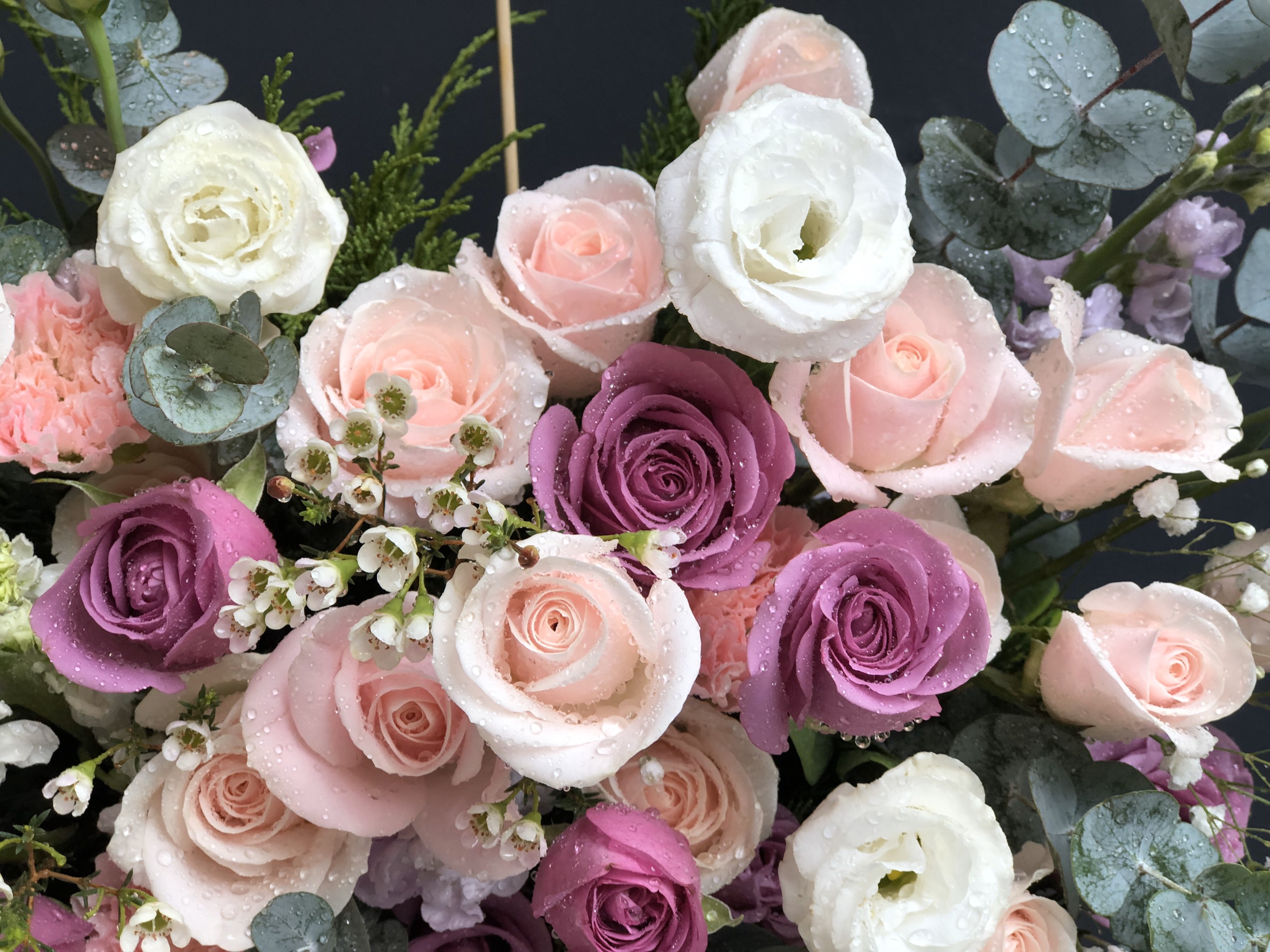 Ở lẵng hoa sang trọng này Elise Flower sử dụng chủ yếu là loài hoa hồng, hoa cúc hồng nhạt song song với đó là các nhánh hoa trắng nụ nhỏ,..Đối với hoa hồng thì Elise Flower đã lựa chọn ra hai loại hoa hồng, đó là loại hồng kem dâu, hồng tím huế. Ngoài ra thì chúng tôi có dùng đến những loại khác không kém phần tinh tế, như thanh liễu trắng, lan tường trắng, phi yến. Cùng với lá bạc, nhánh hoa baby để giúp tăng thêm điểm nhấn cho lẵng hoa hồng sang trọng này.