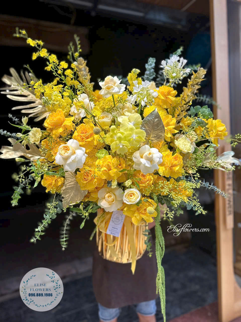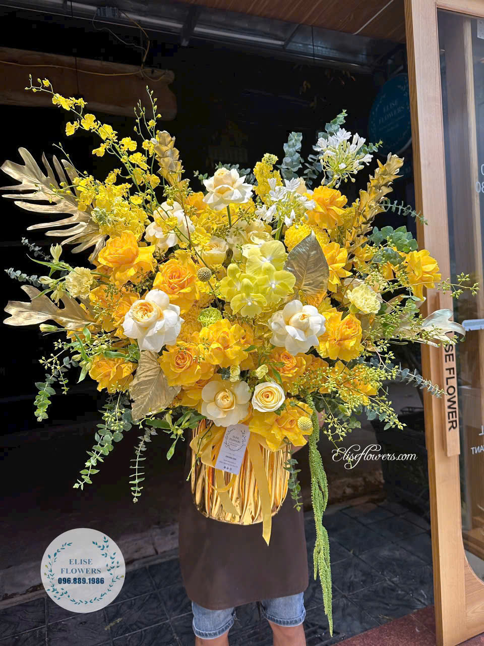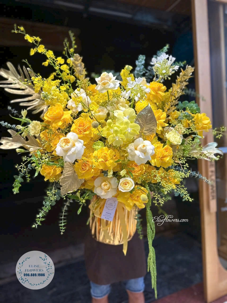 Với sắc vàng chủ đạo, lẵng hoa như tỏa ra năng lượng tích cực, ấm áp, tạo cảm giác vui vẻ và lạc quan. Mỗi bông hoa được lựa chọn kỹ lưỡng từ hoa đồng tiền, hoa lan, hoa hồng vàng, hay hoa hướng dương - những loài hoa biểu trưng cho tài lộc và may mắn. Sự kết hợp tinh tế này không chỉ làm nổi bật không gian buổi lễ khai trương, mà còn gửi gắm lời chúc đến người nhận về một hành trình kinh doanh thành công rực rỡ, vững bền và phát đạt.