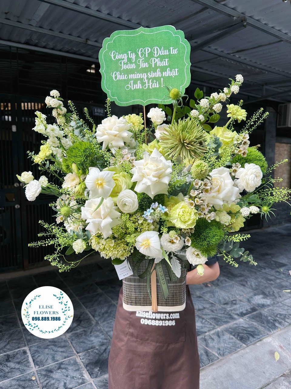 Lẵng hoa tone xanh cốm chúc mừng khai trương | Điện hoa khai trương Hà Nội