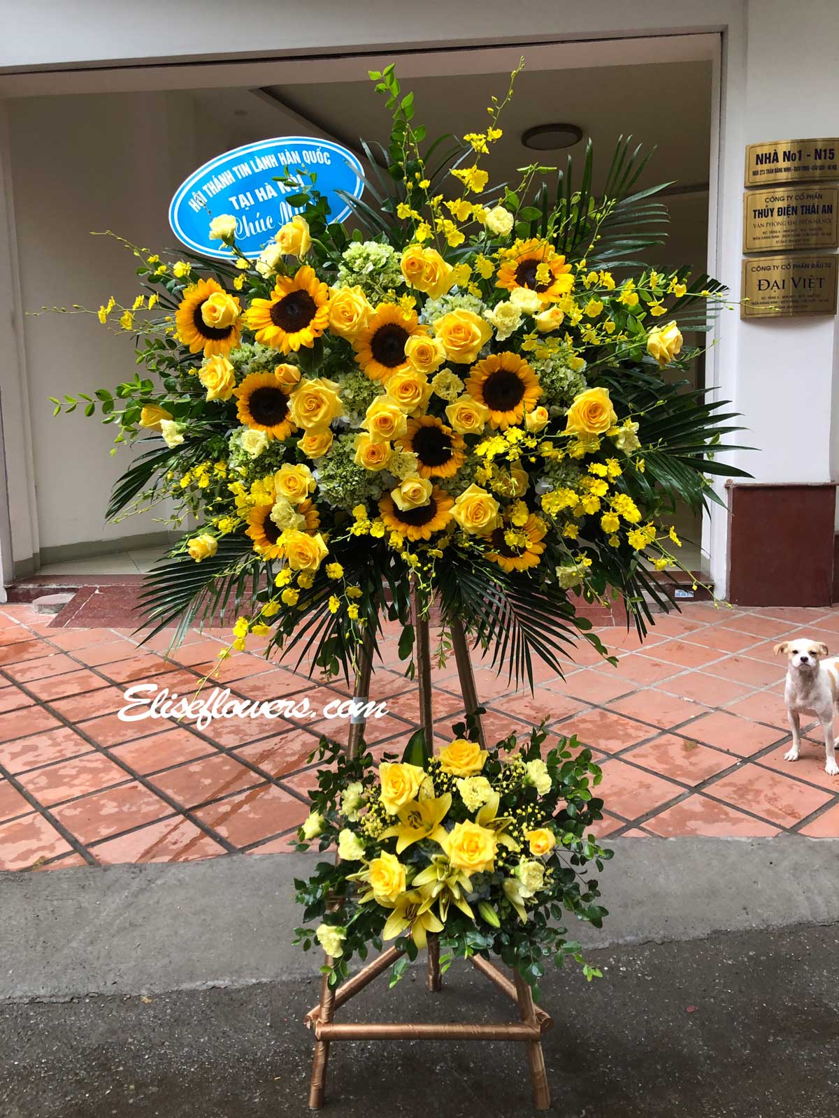 Mẫu kệ khai trương tone vàng - lan vũ nữ tại Elise flowers - 273 Trần Đăng Ninh