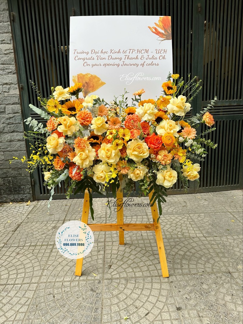 Nếu bạn yêu thích mẫu hoa khai trương khung tranh - hoa khai trương giá vẽ này, hãy liên hệ với Elise Flowers qua số hotline 0968891986 - 0945891986 sớm để shop chuẩn bị nội dung in biển cán trên nền bảng nhé.